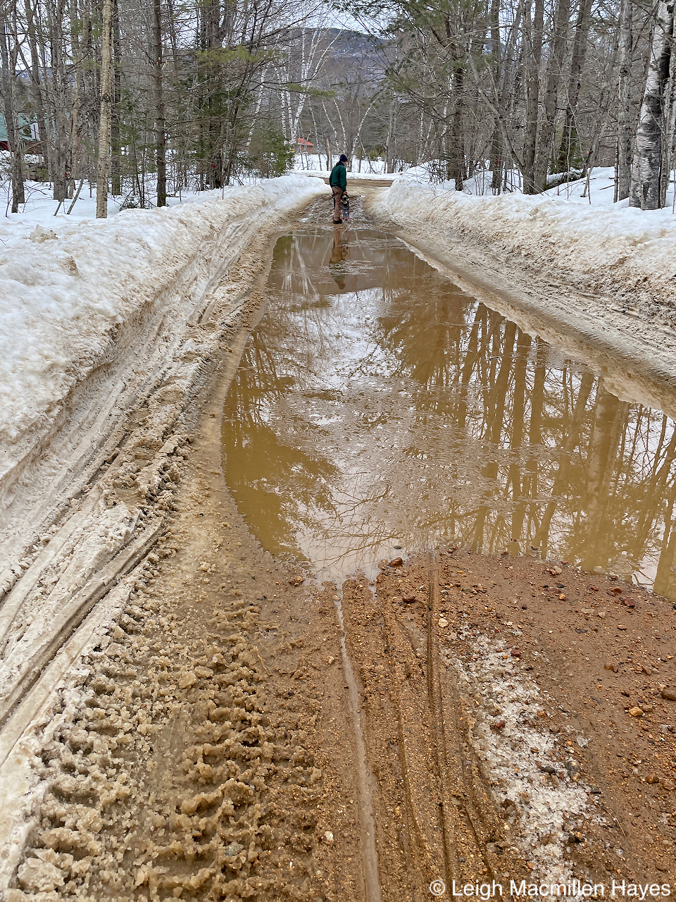 By the time we reached the dirt road to the trailhead, it was really beginning to snow/sleet, and so rather than drive the 1.2 miles up, I found a good place to park, and walk up we did. Mind you, had My Guy been behind the wheel, our journey would have been different. But . . . as steep as the road was at times, I LOVED walking along it.
