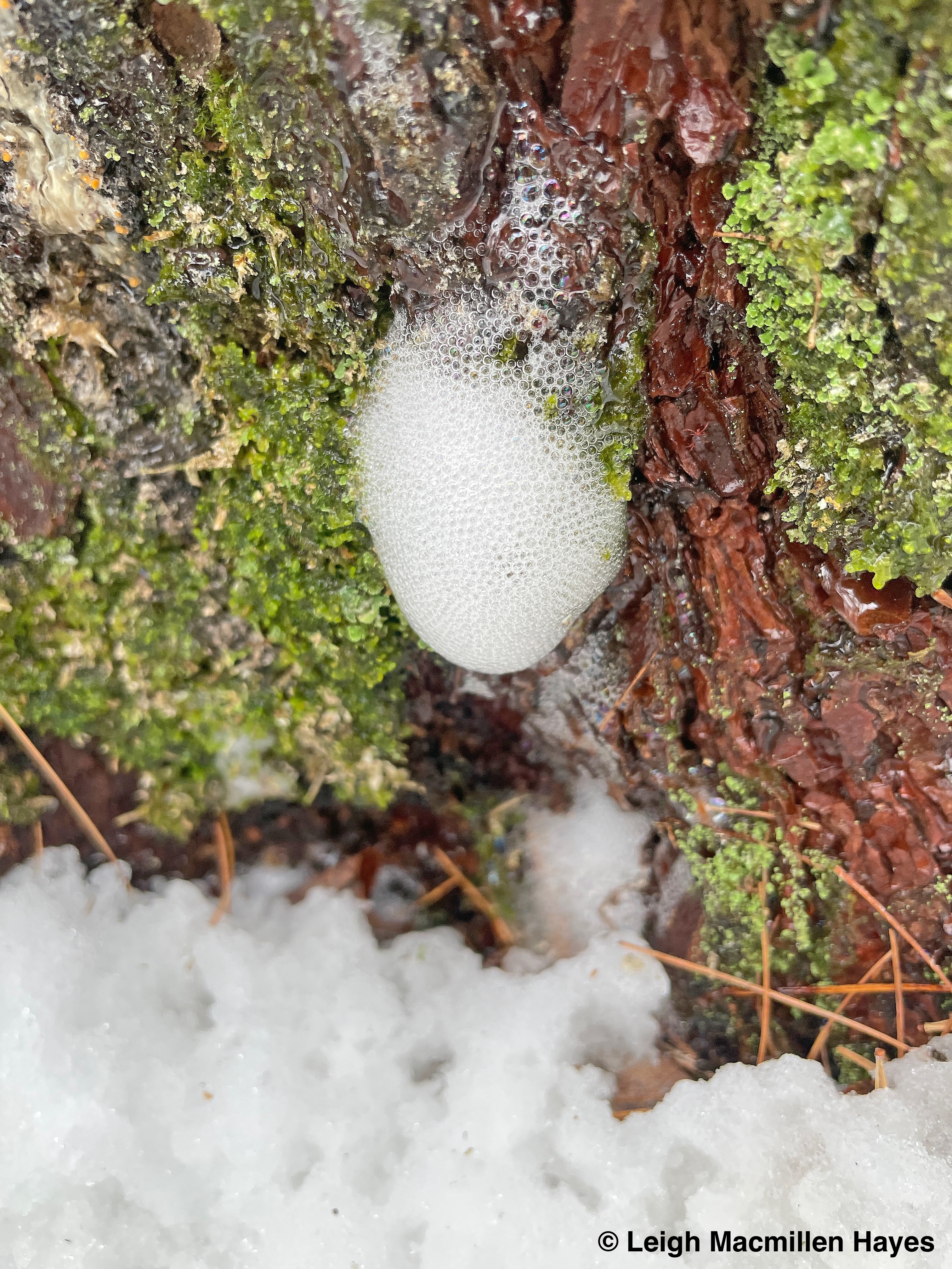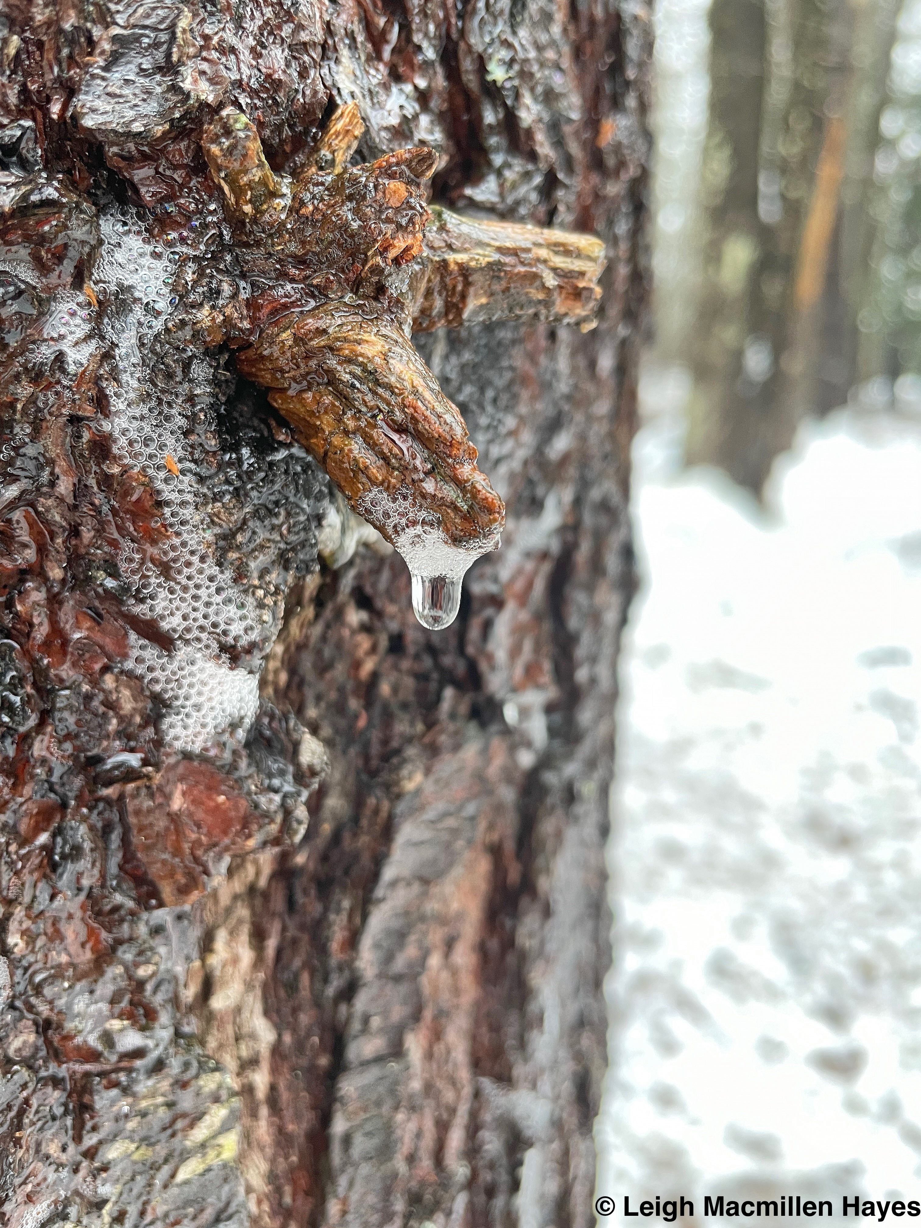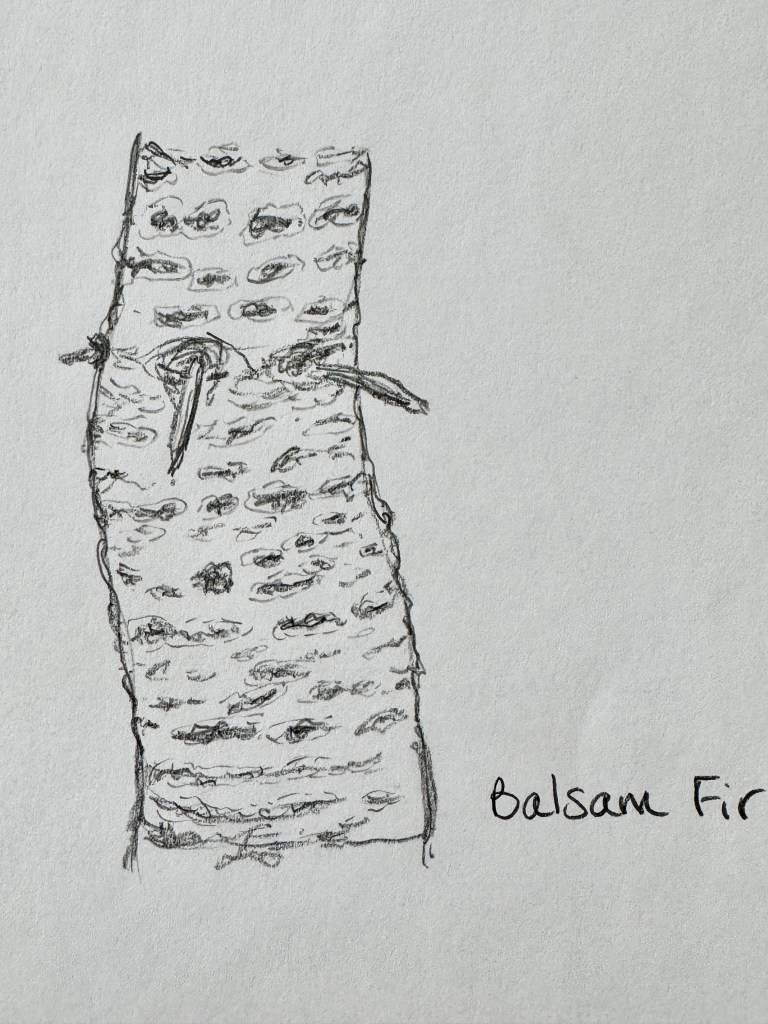 Its bark is pale gray and smooth, but covered with small dash-like raised lenticels and blister bumps filled with a sticky resin. Pick up a stick when there are puddles nearby, poke a blister and let the resin ooze onto the tip of the stick and then place the stick into a puddle and watch the essential oils form and change shape on the water’s surface. This works best on calm water.