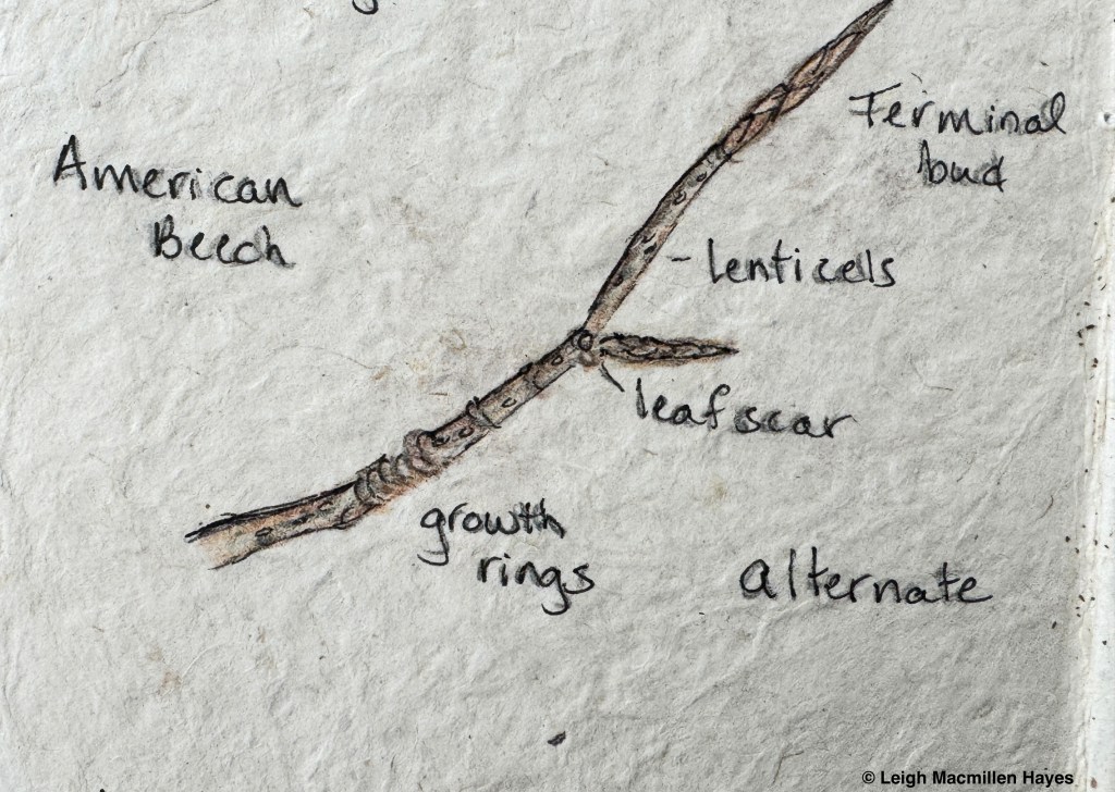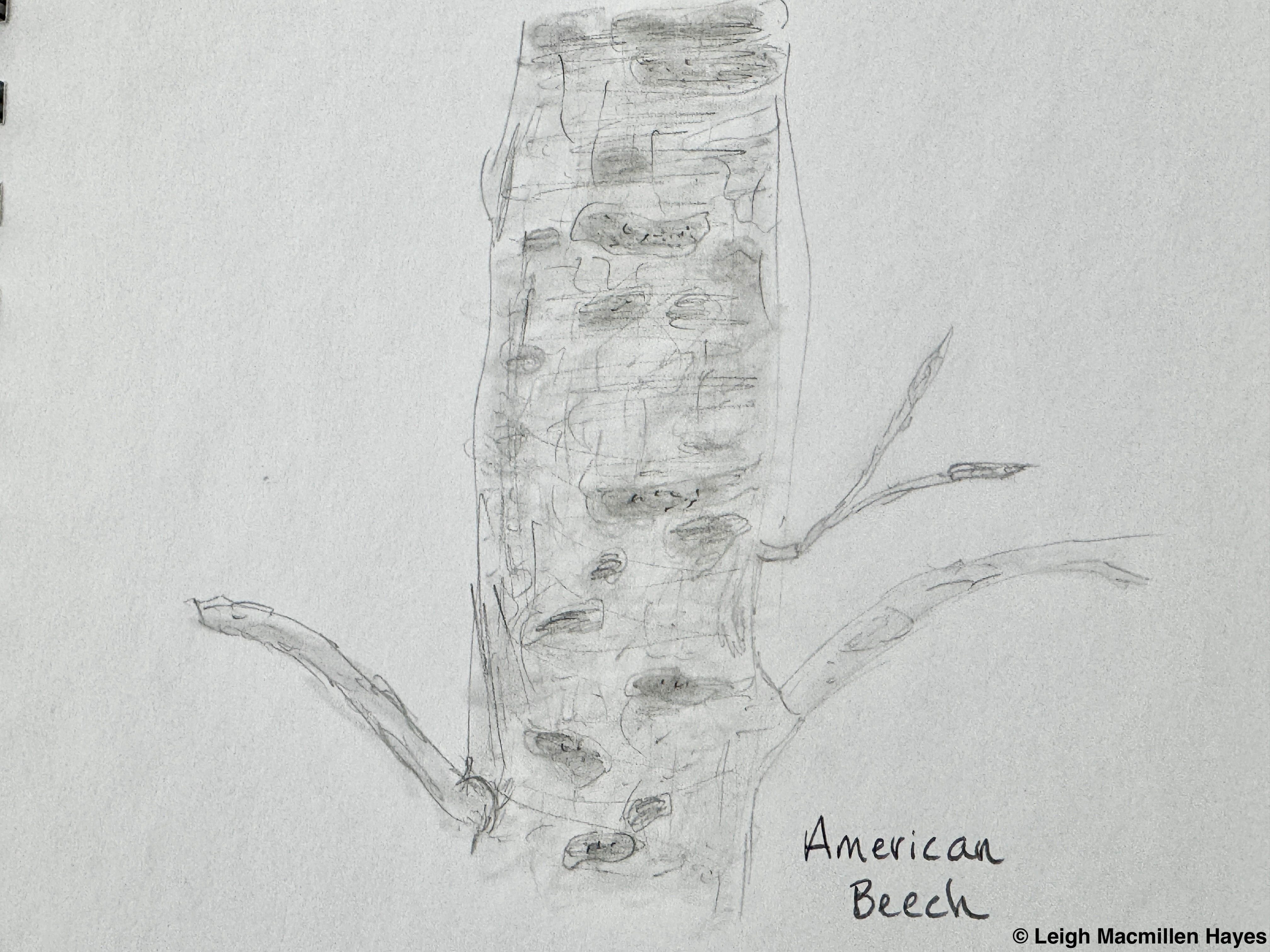 Beech twigs are deep brown with white lenticels. Oh yikes. We haven’t talked about lenticels yet. All trees have them. A lenticel is like the pores in our skin and allows the tree to exchange gases. Lenticels come in a variety of shapes including raised circular, oval, and elongated. (Remember, leaves have stomata for the same purpose.)