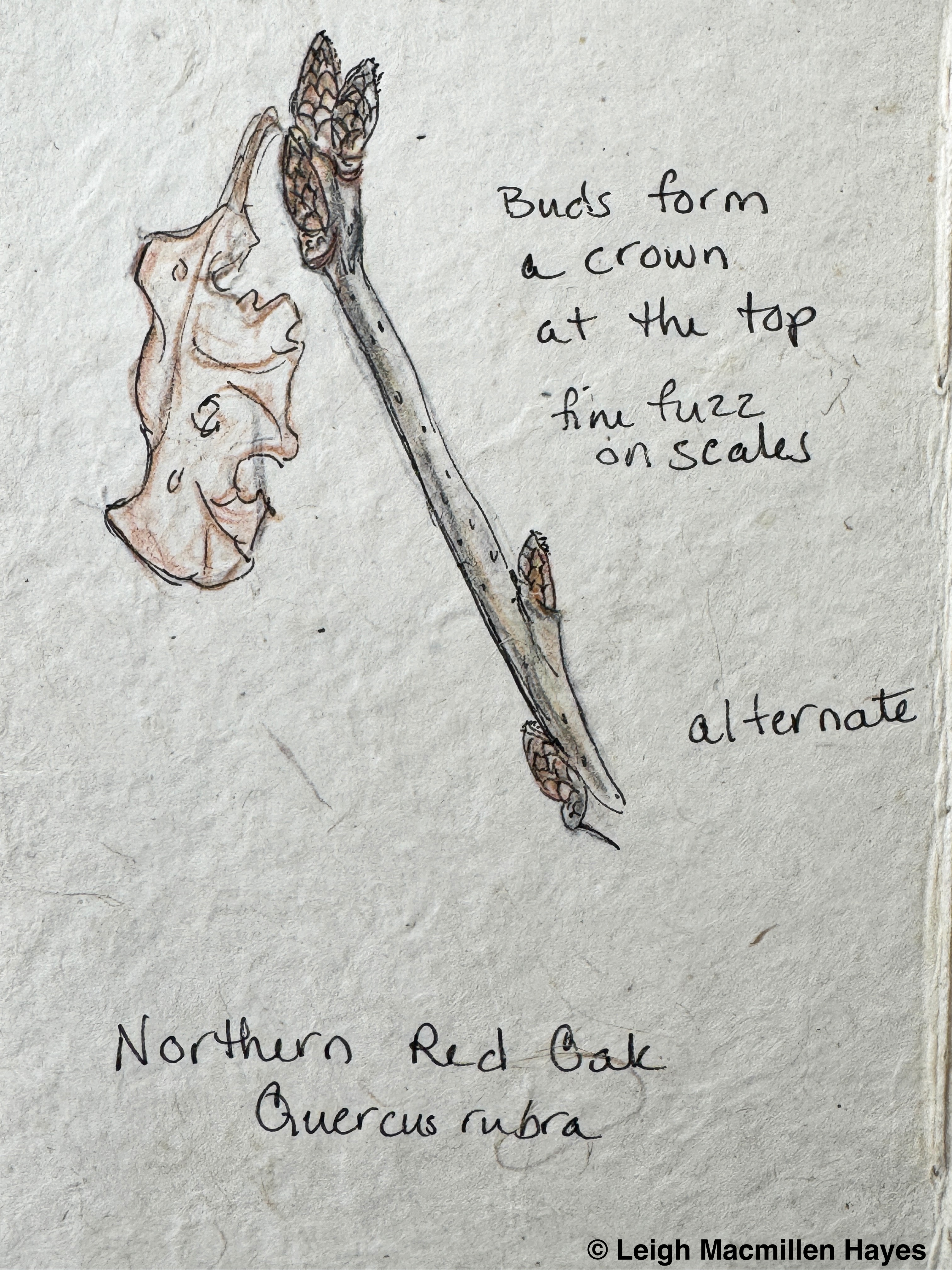 And the twig. As you can see, there are also buds along the twig, not just at the tip, and they do grow alternately. Also, Oaks have marcescent leaves as well, though most fall off before spring. I did spot a very mature Red Oak the other day that is overwhelming full of dried leaves.