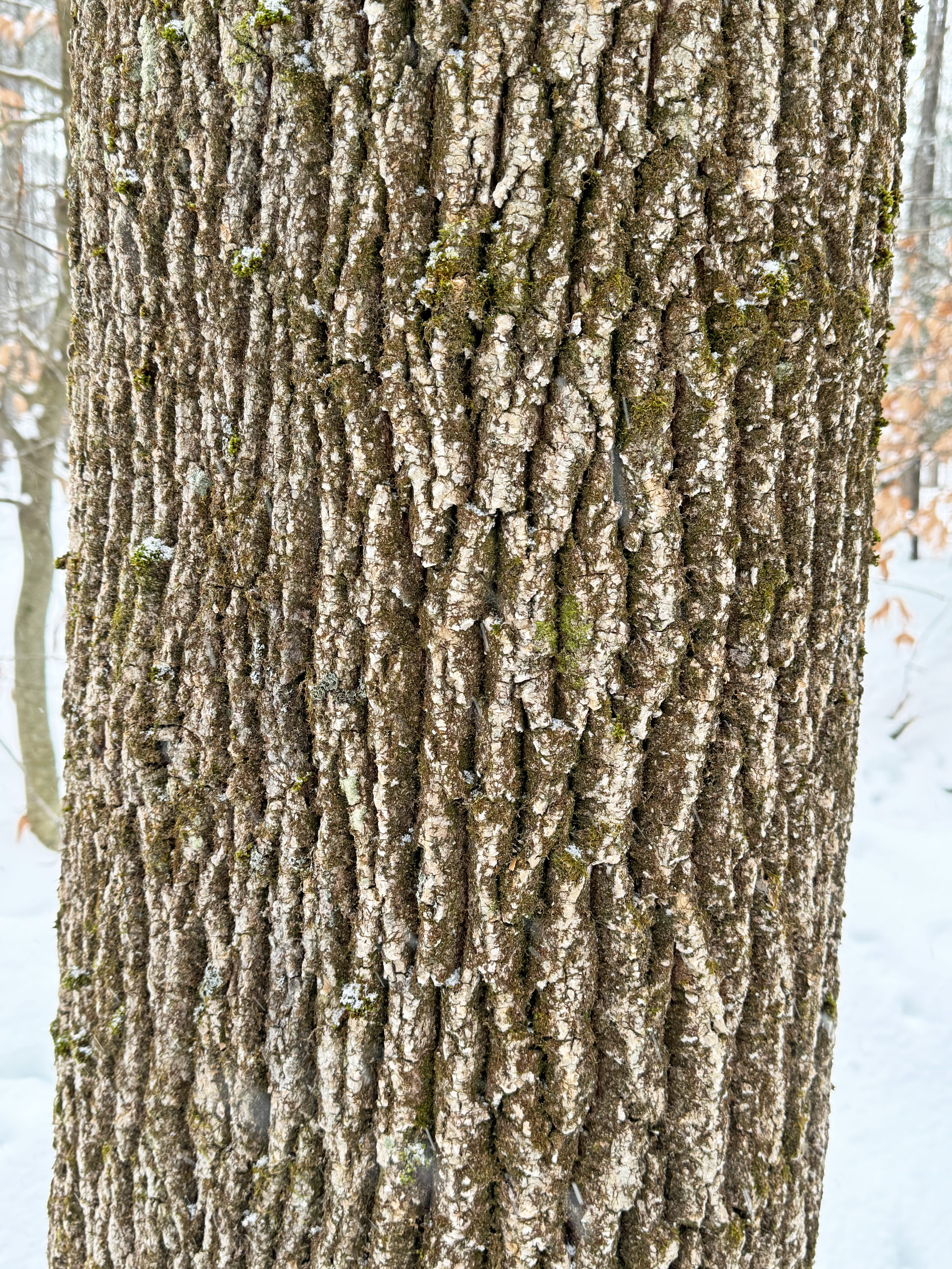 And now for an upclose look at the bark of Northern Red Oak, Quercus rubra. (I almost wrote Maple, and for some you’ll know that as “my mouth or in this case my fingers before my brain”–like when I call a Beech, that I know darn well is a Beech, a Birch. Such is life.)