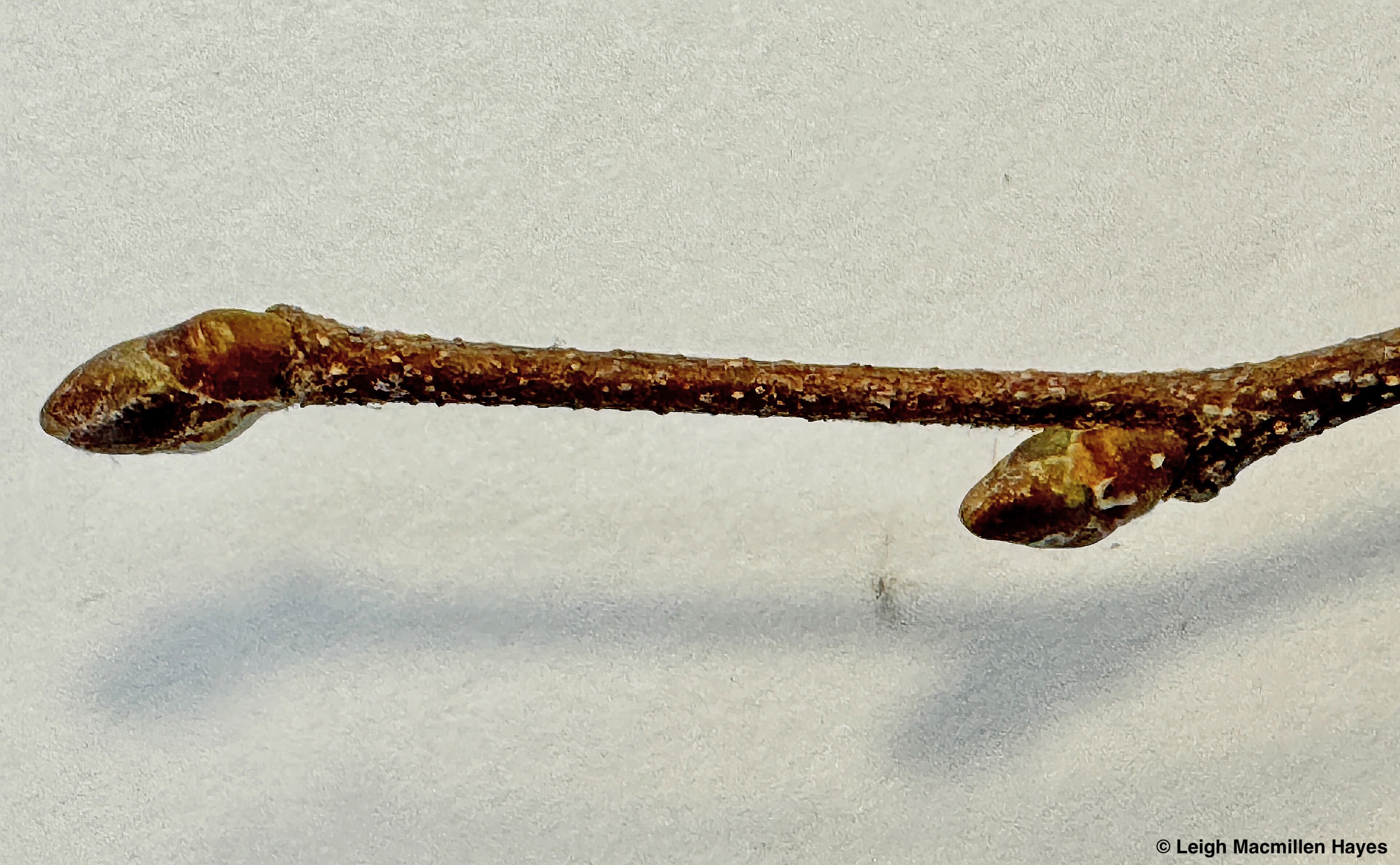 The twigs and buds are alternate in orientation. The twigs are smooth, and greenish brown, but the buds are much more intersting as they occur in a crown at the tip of the twig. Each bud has many scales and matted wooly hairs. I love their chestnut brown color.
