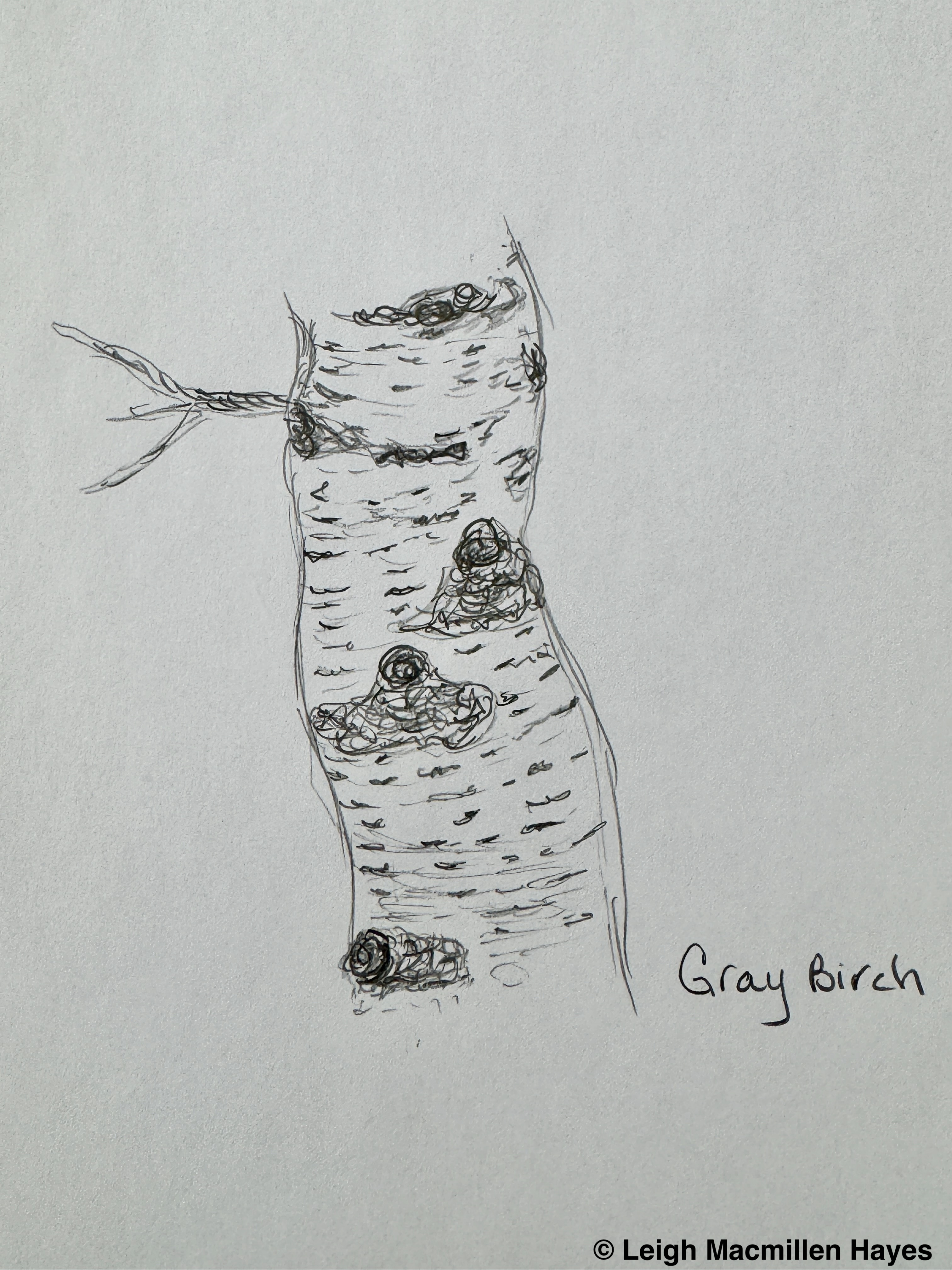 Gray Birch twigs are very fine, and super warty. In fact, it’s fun to run your fingers over them and feel the lenticels, like someone glued salt crystals to them. Their coloration is dull gray to brown and they are not hairy, nor do they smell like wintergreen when scraped.