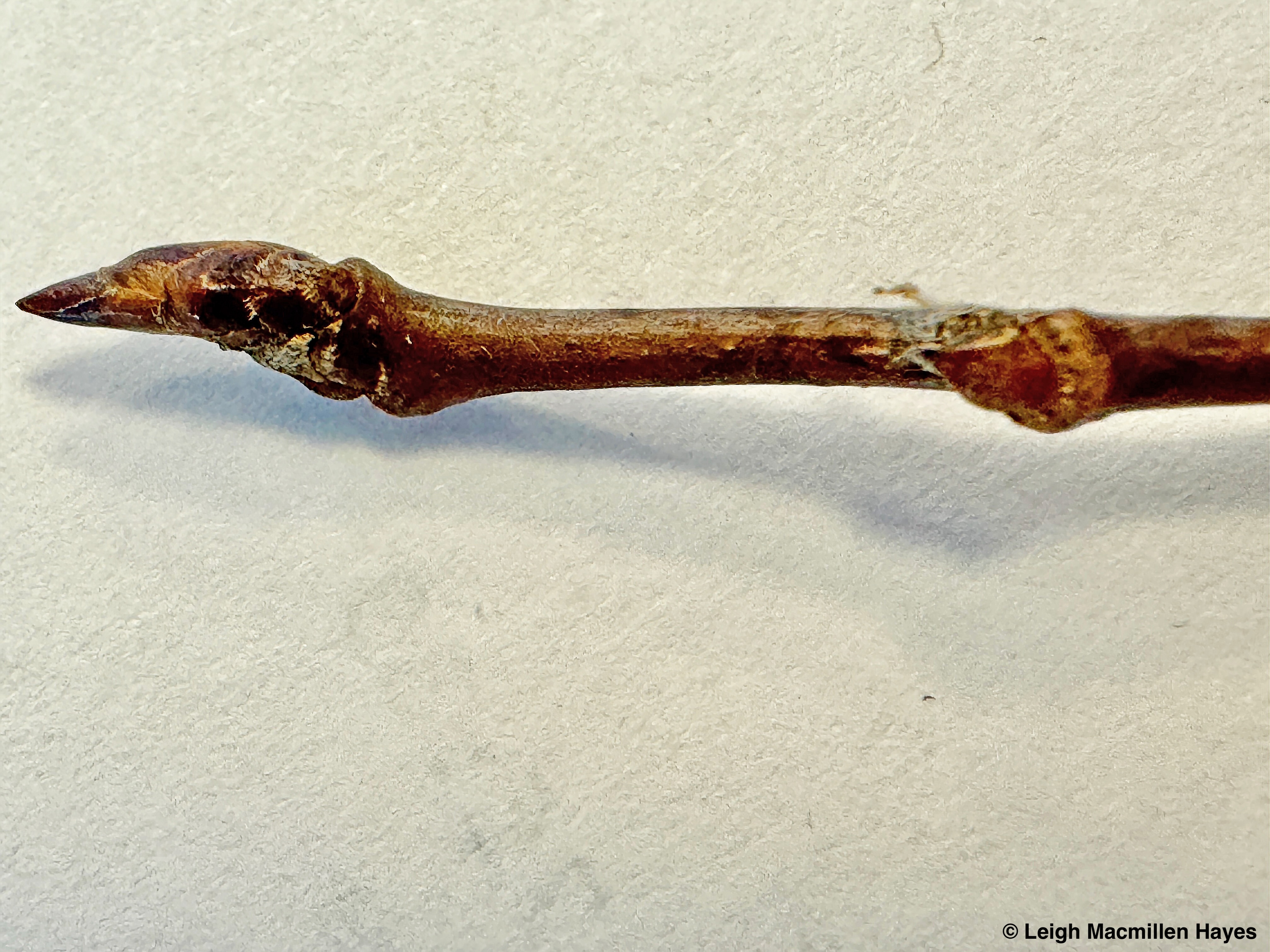 Back to the shape–can you see how the bud dips a bit down into the leaf scar rather than sitting across the top of it. This tells us it is a White Ash and not a Green Ash. Add to that the fact that the terminal bud is not hairy.