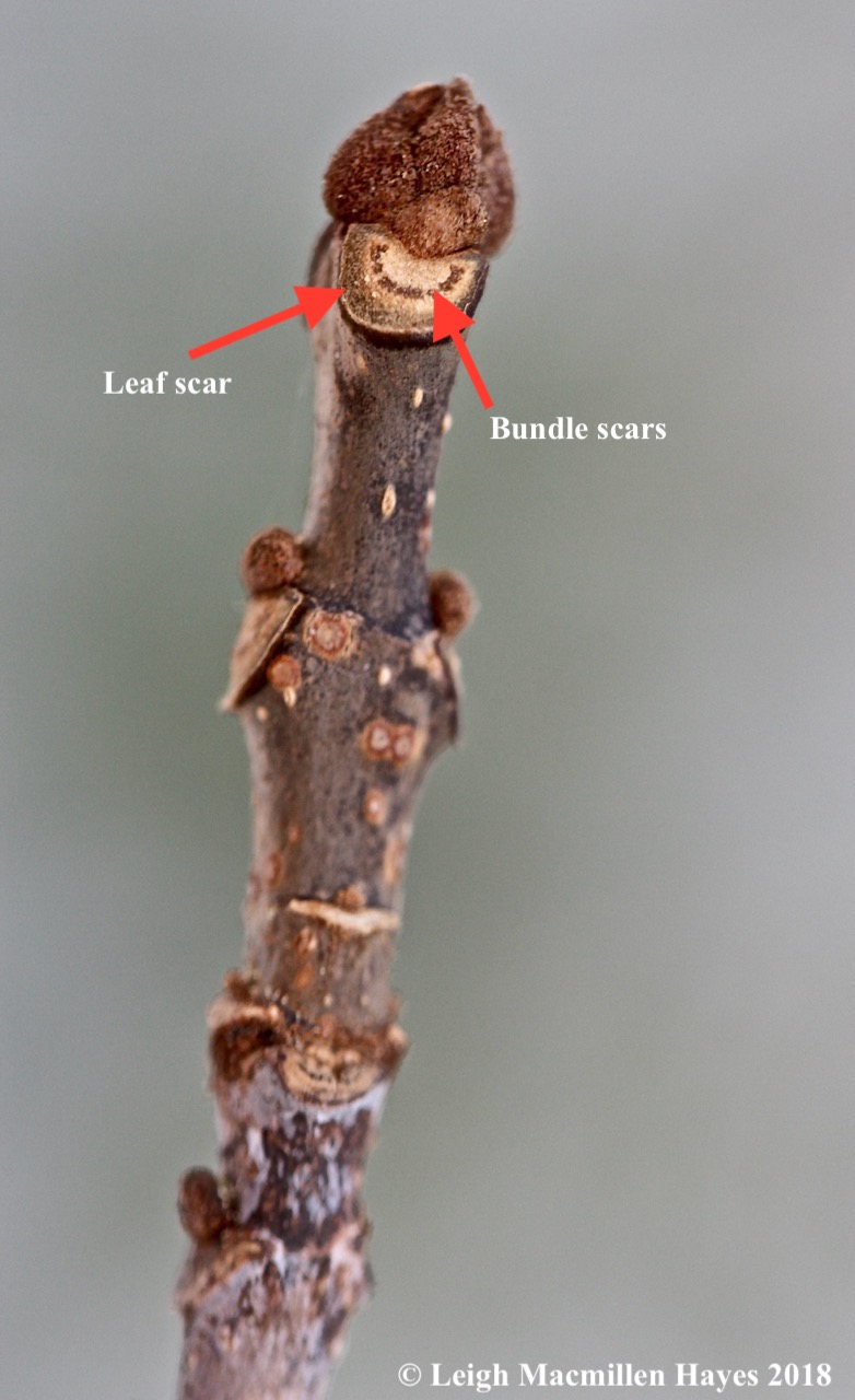 One of the features that speaks to the color of this Ash is the shape of the leaf scar below the new bud. A leaf scar is where last year’s leaf was attached until the end of the growing season. At that time an abscissa layer formed between the petiole (stem) and the twig. The leaf fell off and the tree healed the wound quickly with a protective cork. The bundle scars are part of the pipeline as they were the vascular tissue contained in the petiole of the leaf. Each tree has its own number of bundle scars located within each leaf scar.