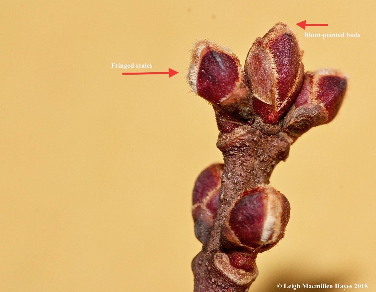 Each bud has 3 or more scales and each scale is fringed with little hairs. The twigs are straight and also red, especially newer wood.
