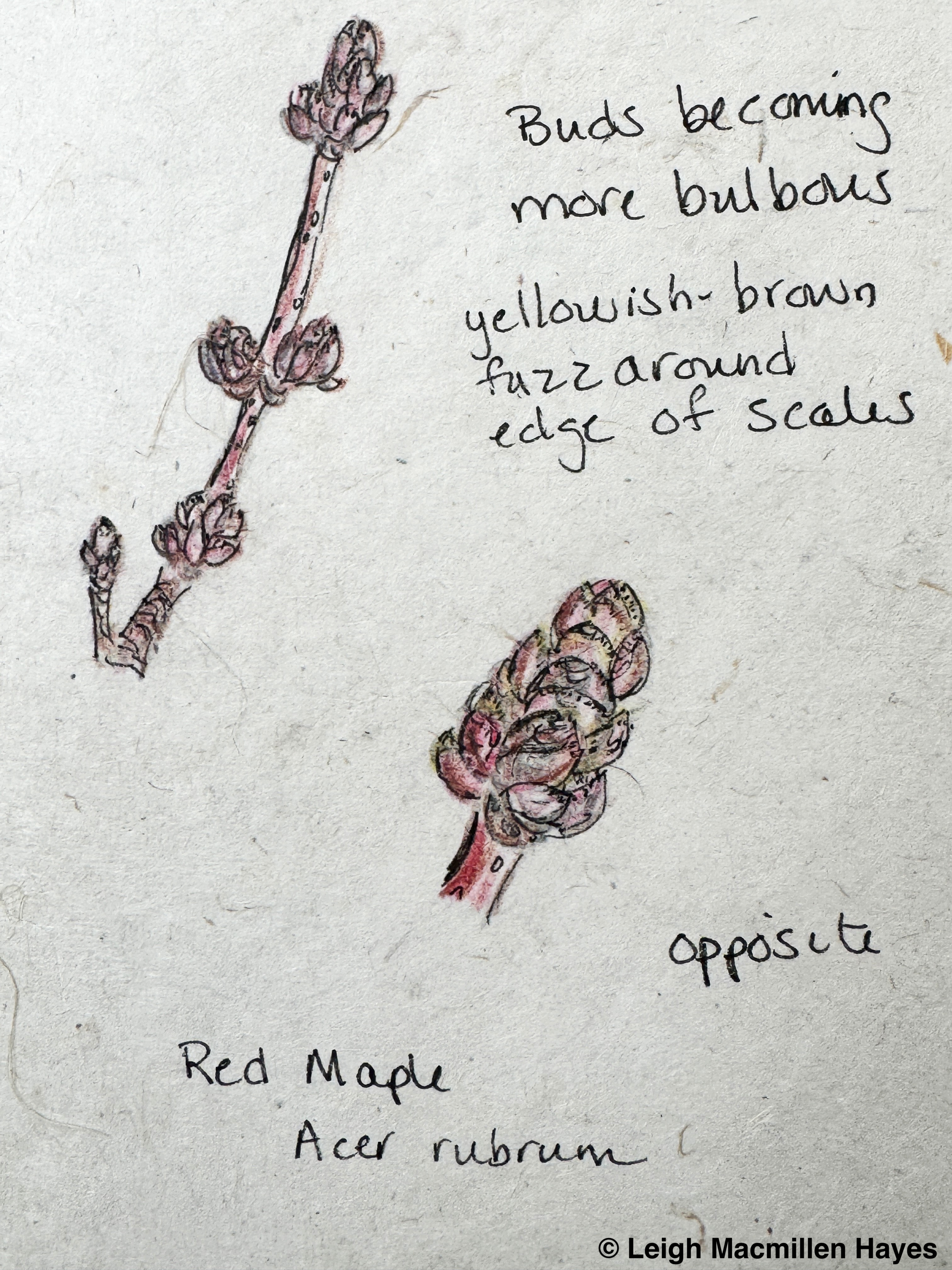 As you can see, the buds are red. This is another clue that it’s a Red Maple: there’s always something red on the tree. Sugar Maple buds are much smaller and brown.