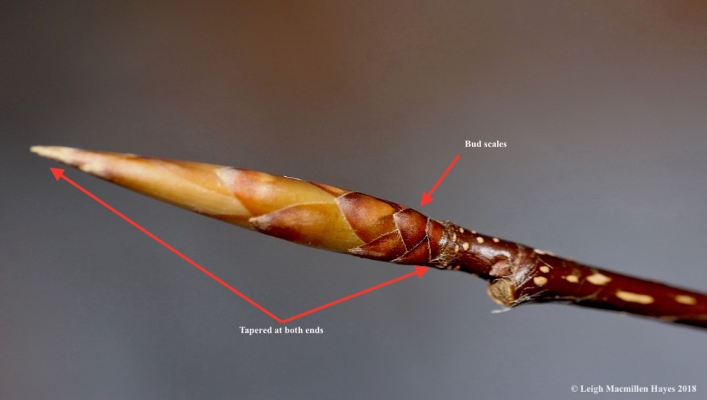 As you can see, the bud is sharp-pointed, covered with many scales, and a delightful golden brown. Some see it as a cigar. That description doesn’t work for me, but it is tapered at both ends. And really, nothing else looks like this in the north woods. While this photo is of a terminal bud, the twigs and buds are alternate.
