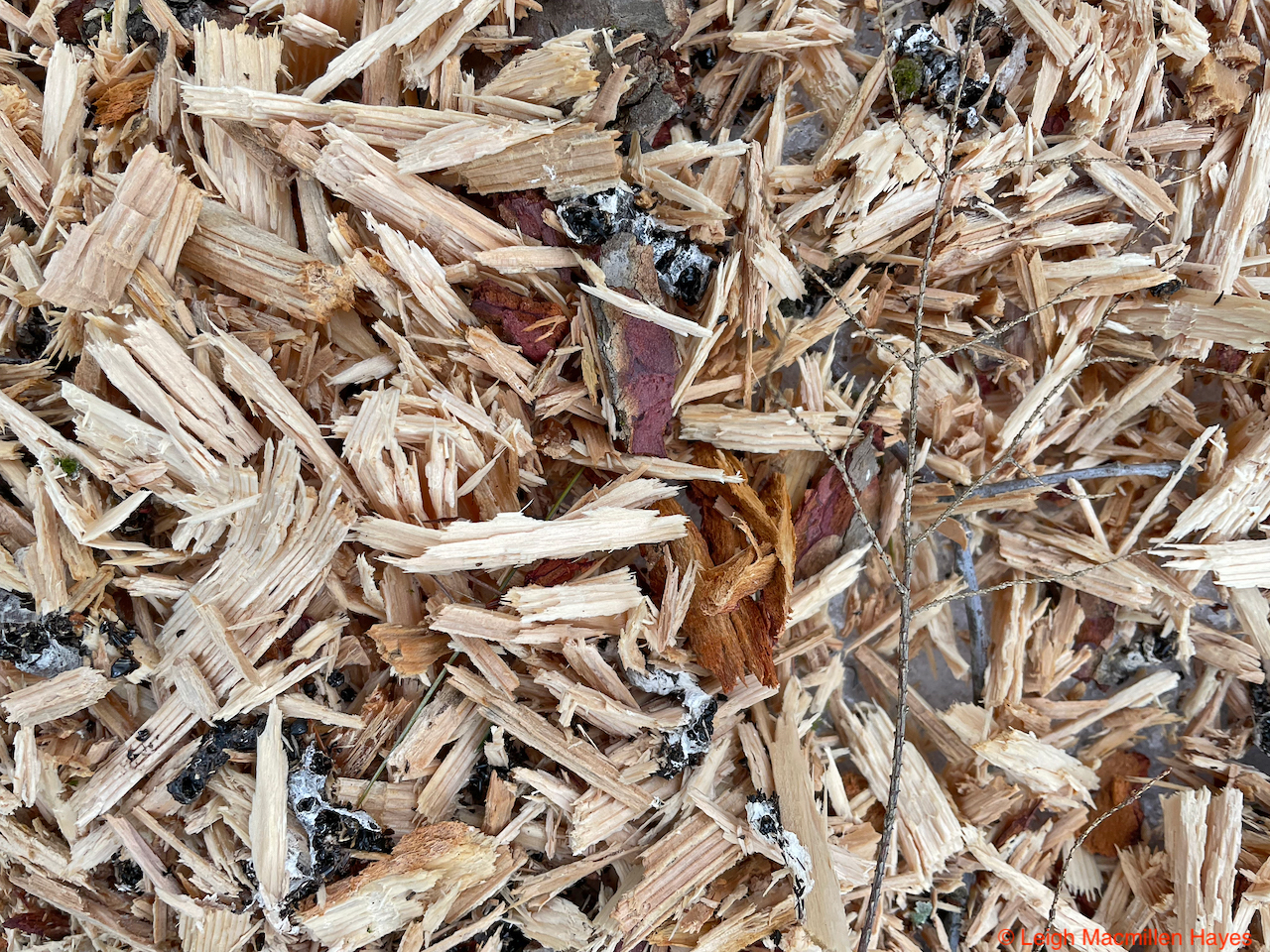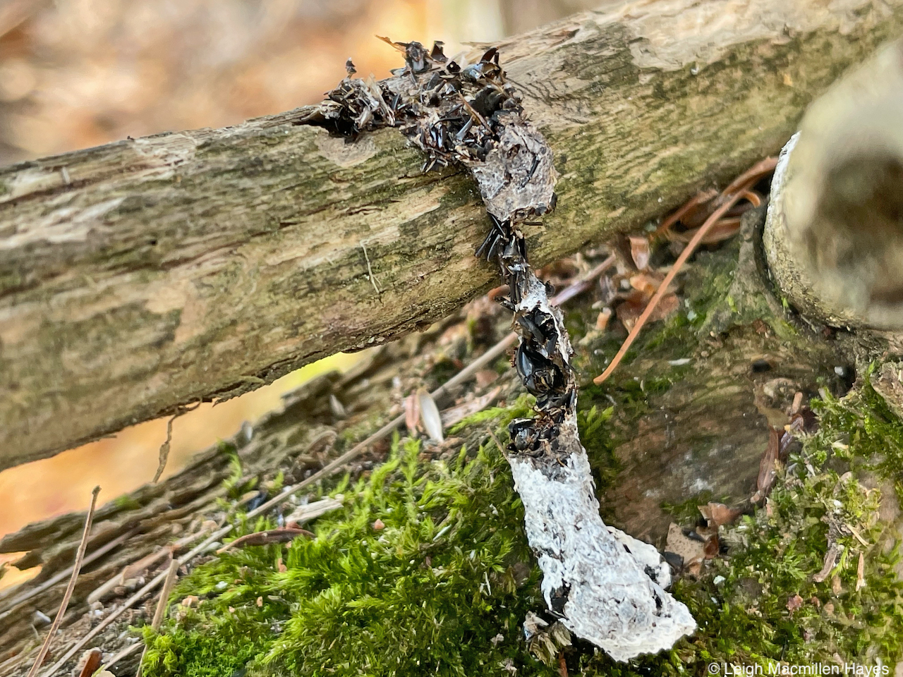 And my playful spirit did what it often does when spotting this species. I found a small stick and poked the little puff balls, which released its spores in a smoke-like manner. I can’t show you the action, but you can see the results of the dried salmony-brown spores atop some of the now-deflated brown balls.