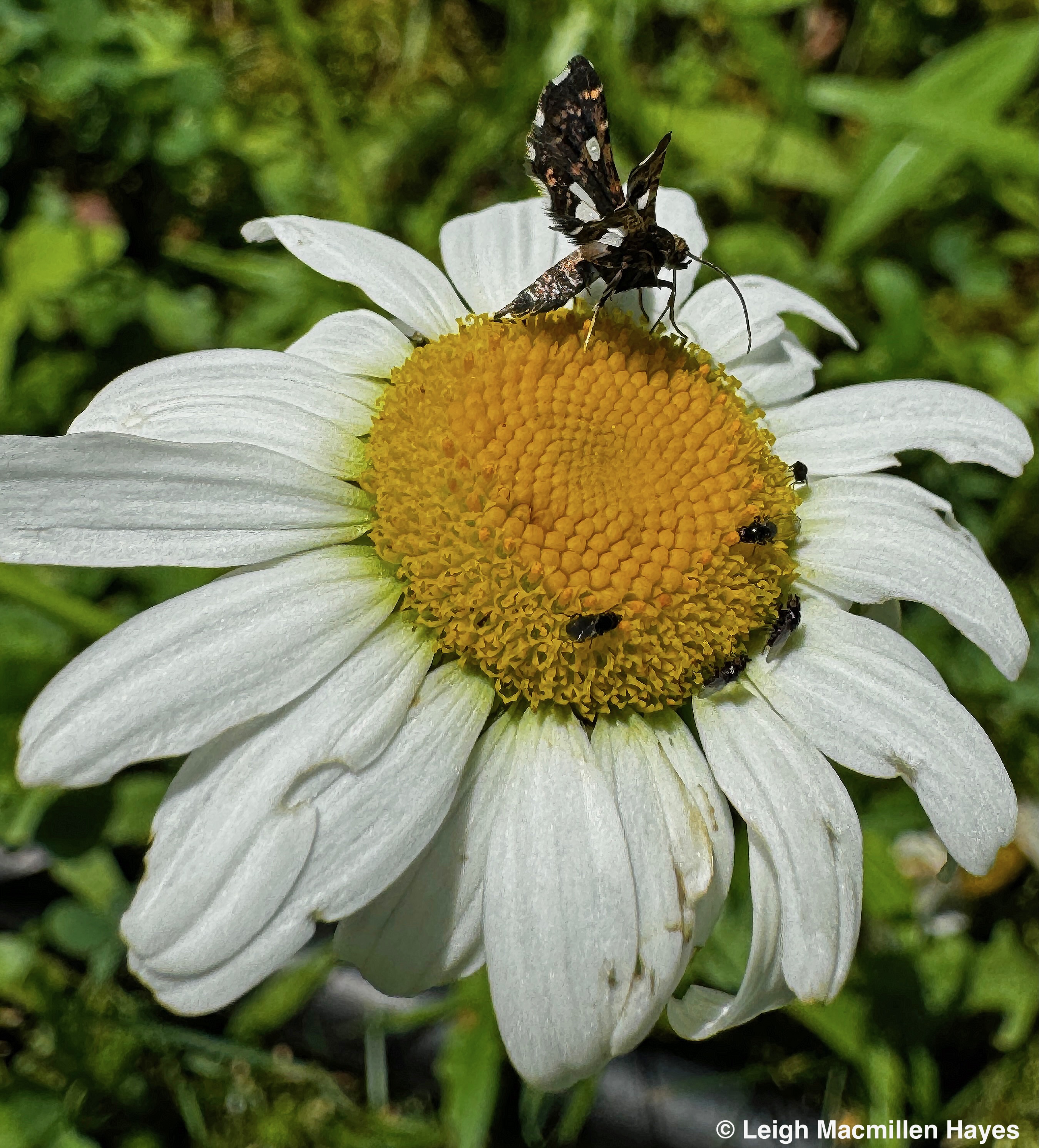 And on a flower about two inches away, an exquisite Spotted Thyris Moth, and a few Gnat-like flies feasted. I kept waiting for them to visit the Crab, but perhaps they sensed its presence. I’ll never know, but while I watched, they stayed on this flowerhead.