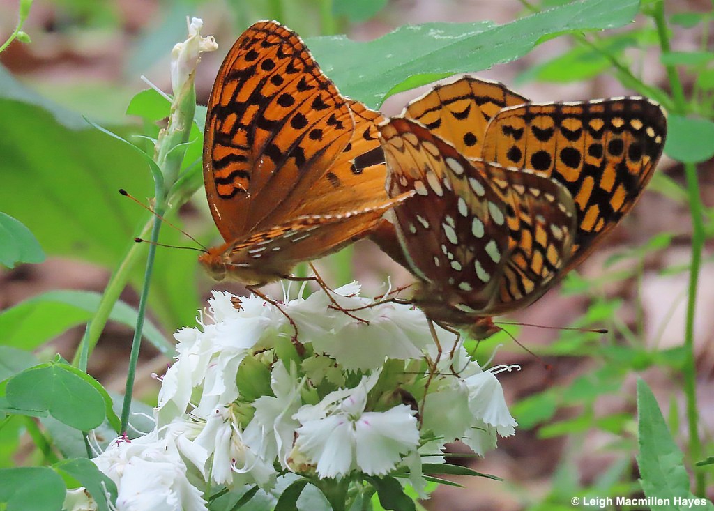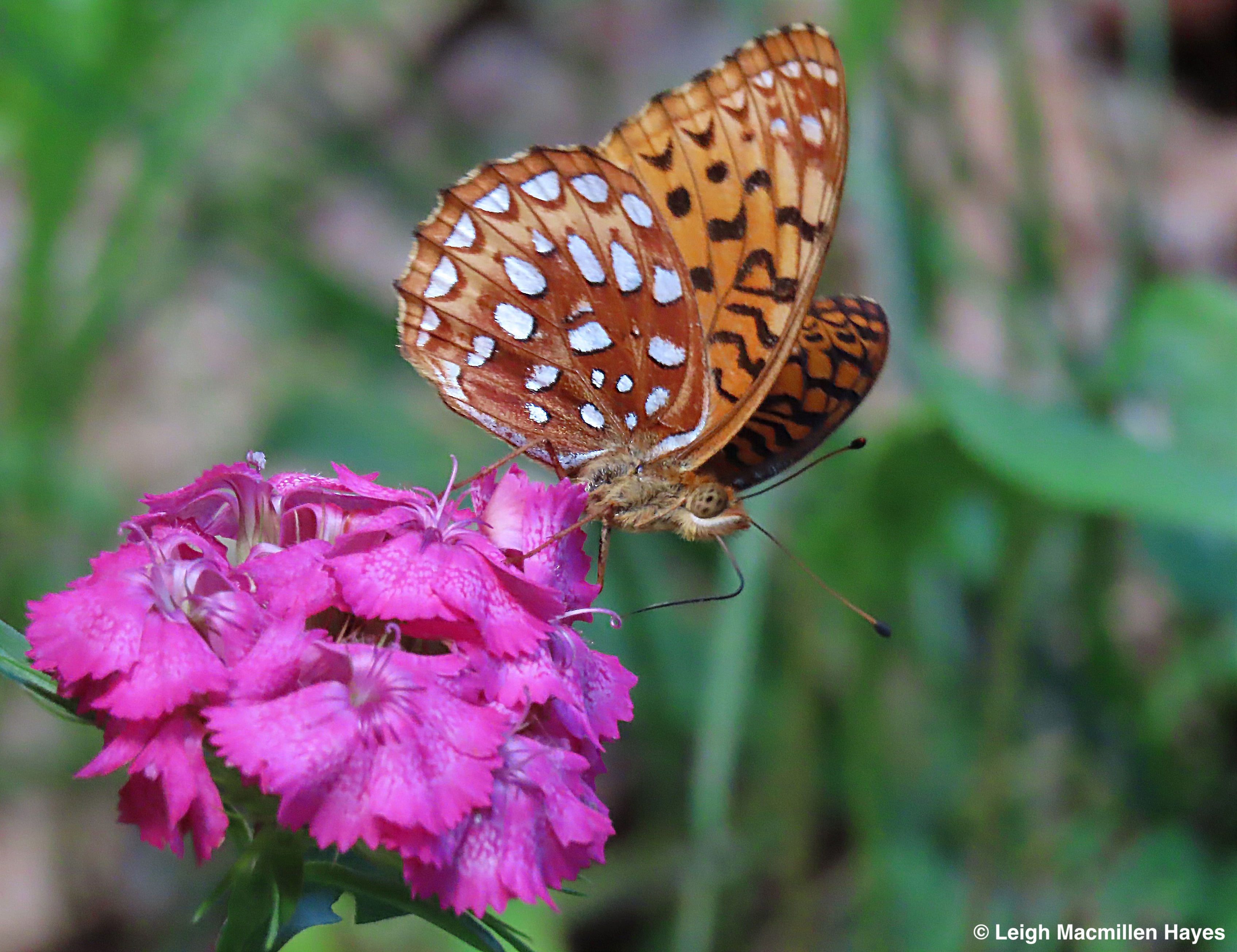 Fritillaries canoodling atop Sweet William. As this story began, it ends. Canoodlers in action.