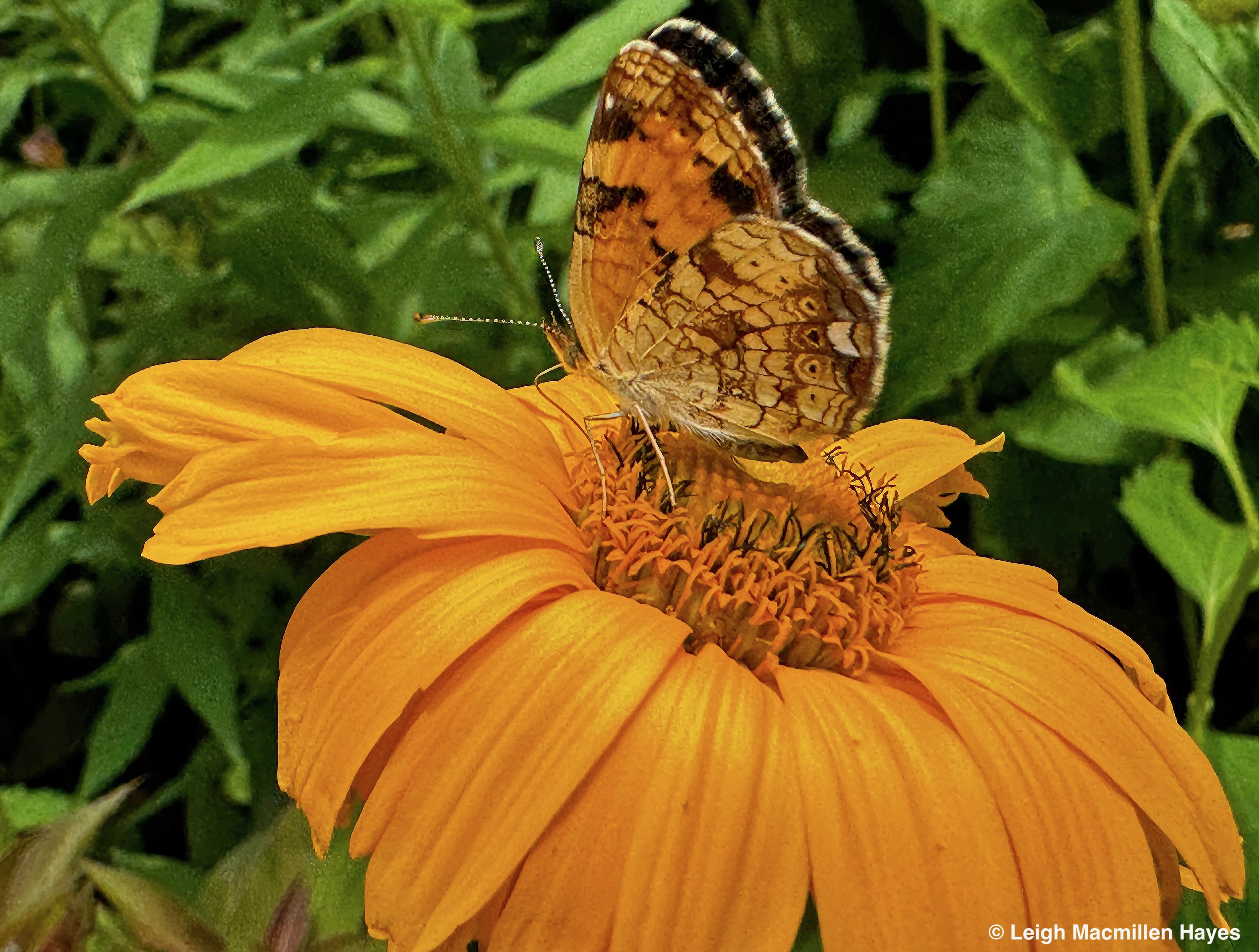 As I’ve said, I walked back and forth for all these days between gardens, which have many more flowers than I’m sharing, but it was these few that seemed to host the most visitors, including this Pearl Crescent Butterfly. Take a look at the underside of the hindwing. About halfway down, close to the edge, do you see the crescent-shaped pearl?