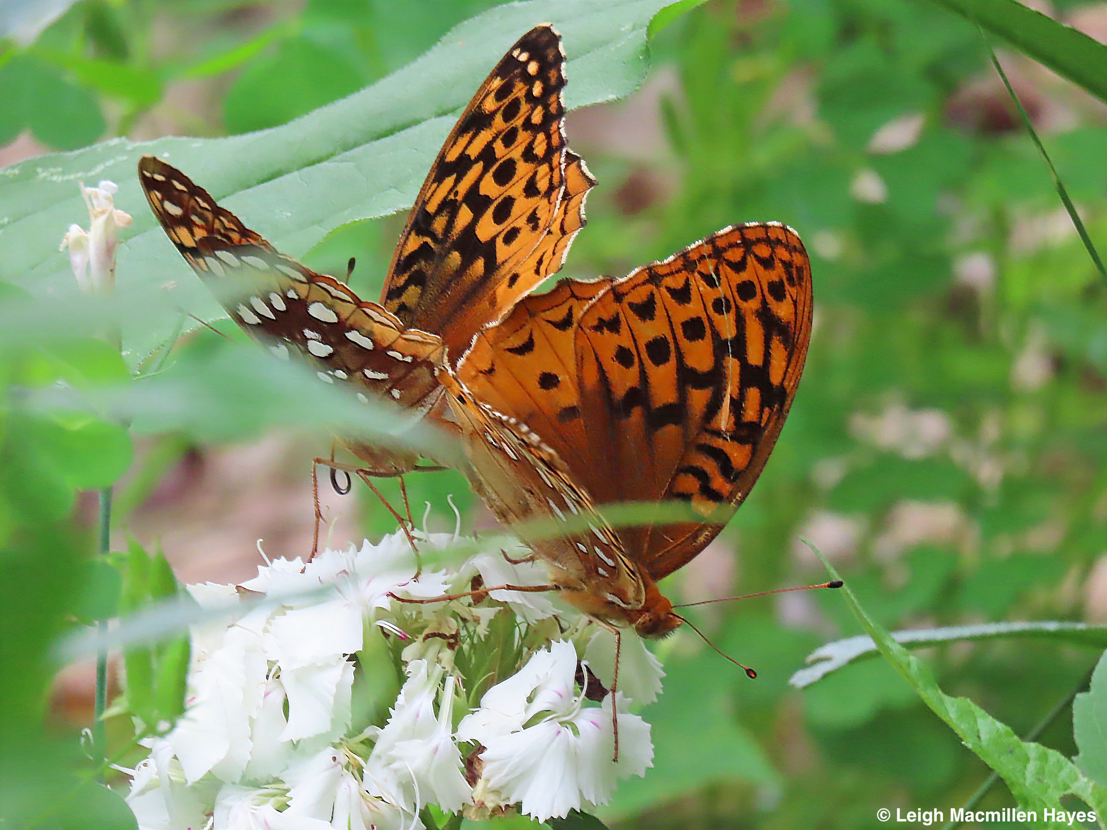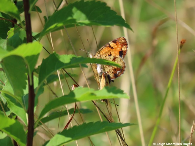 In the midst of it all, other insects flittered and fluttered over the flowerheads, sometimes pausing to seek nectar like most of the others. This Fritillary Butterfly is one of many that took advantage of the gardens as well as the clover growing in the yard.
