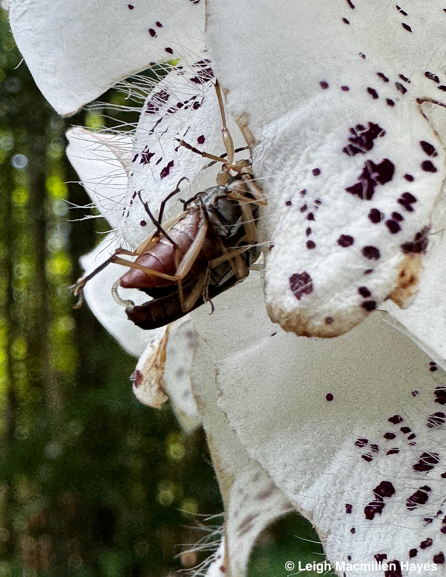 Meanwhile, back at C-s’s hamper, I couldn’t find C-s, but did find the remains of another meal consumed. It continued to amaze me how C-s didn’t care about the size of its prey, while the Crab Spider seemed to have a preference for smaller meals.