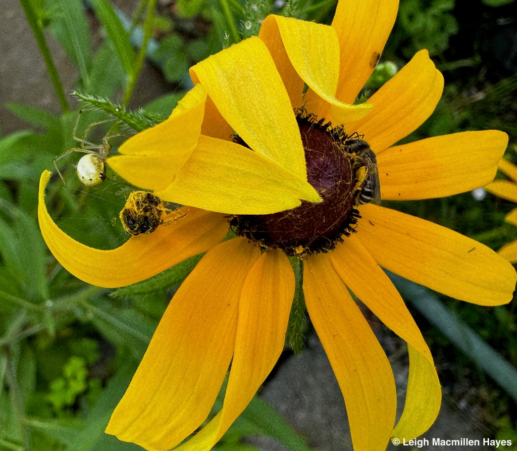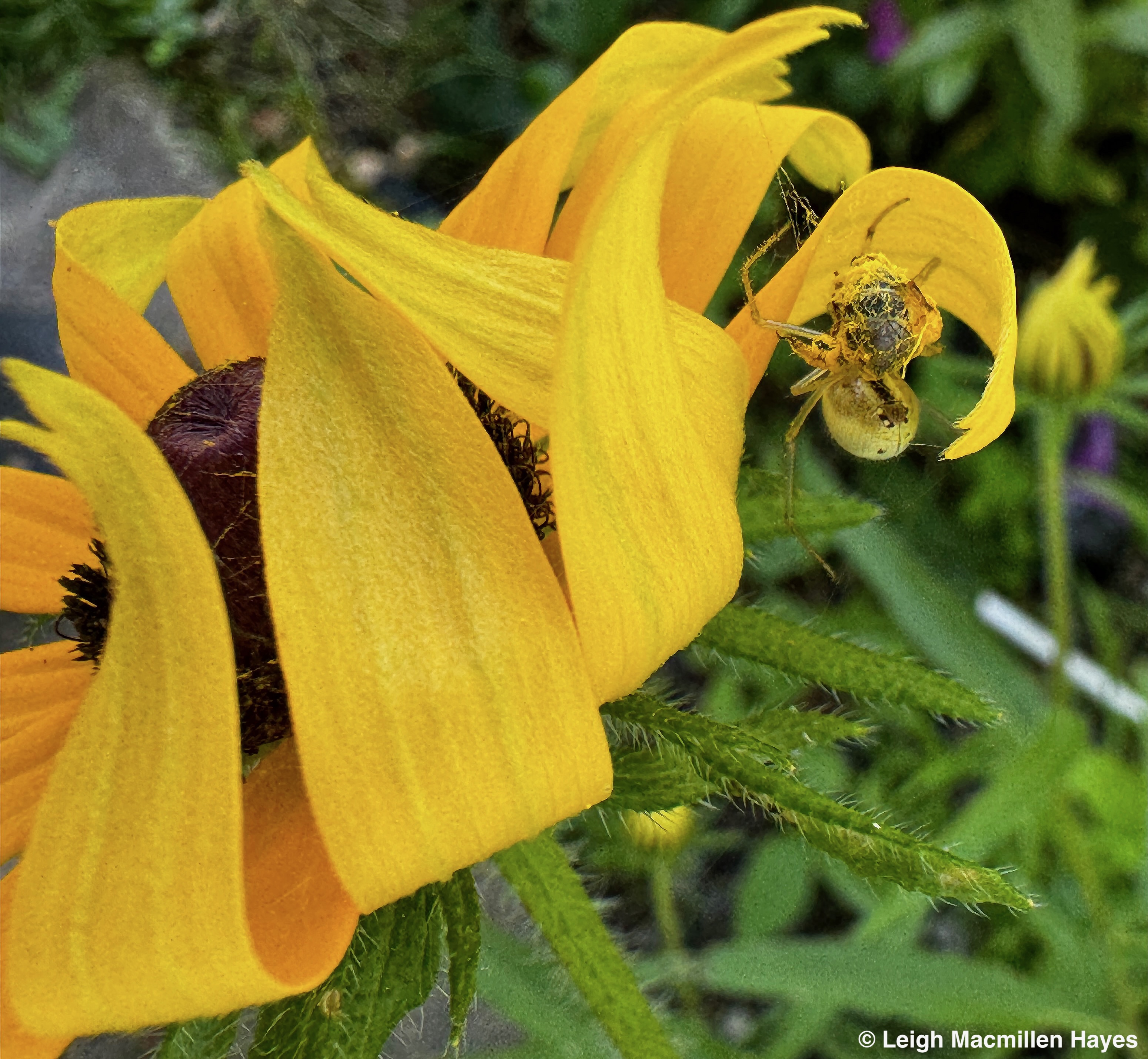 On the edge of another homespun garden, I spotted a Common Candy-striped Spider with a meal sac all packed up, the meal being a bee that seemed like it was probably much larger than the spider. But the spider didn’t care. Meanwhile there was another bee seeking nectar and I worried about its future.