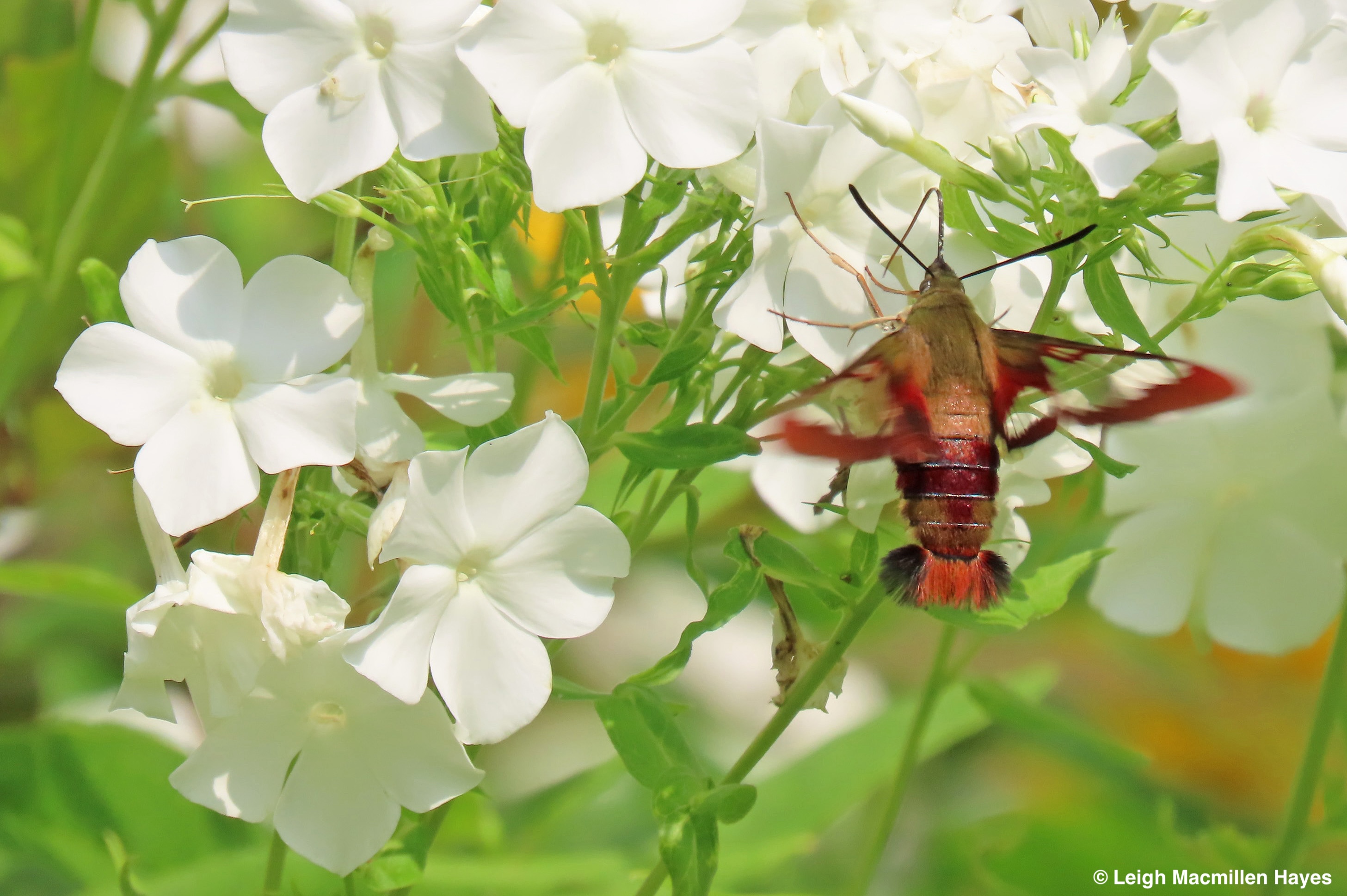Feeding on the Phlox outside the kitchen window was a Hummingbird Clearwing Moth. I’d seen it on several occasions, but the minute I stepped outside it flew off. Until this day when it let me snap numerous photos as I watched it seek nectar from the same flowers our local Hummingbirds love to visit.