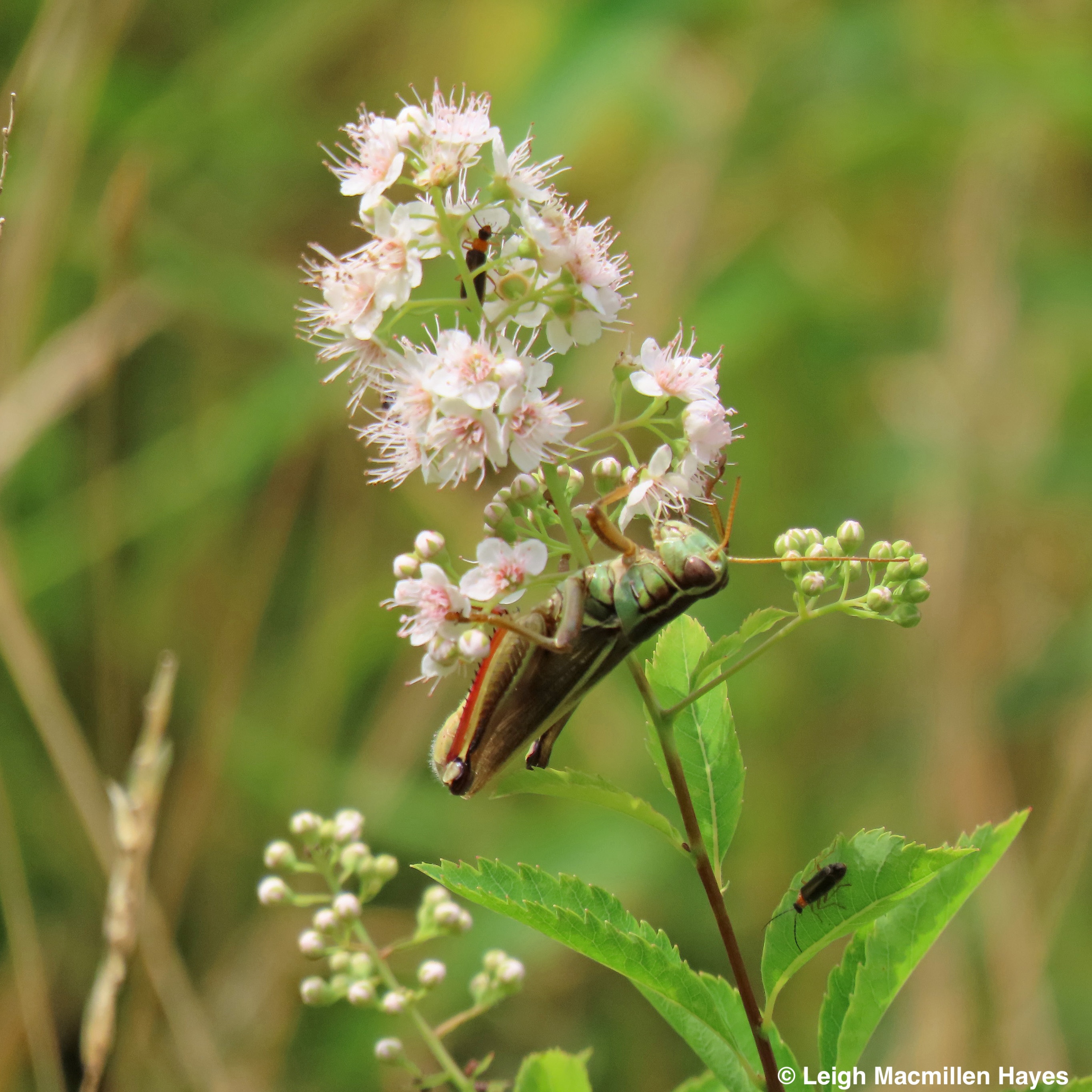 On a nearby Meadowsweet, another in the Spirea family like the Steeplebush, a Two-striped Grasshopper was certain that I couldn’t see it. I could. And I could hear grasshoppers and cicadas and crickets and birds, a field orchestra in full rehearsal form.