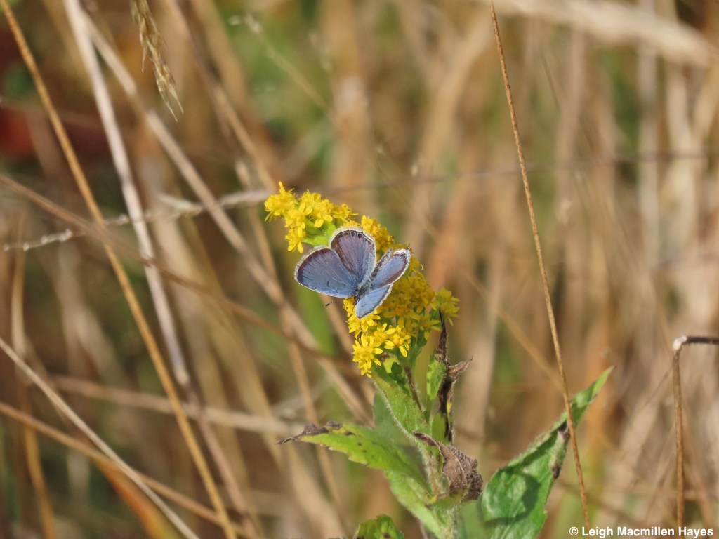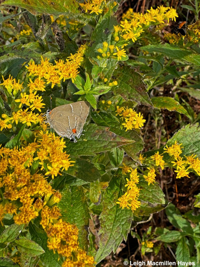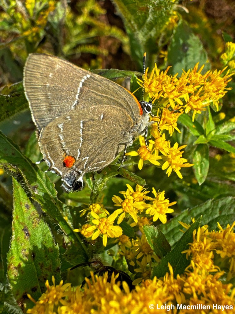 This is a White M Hairstreak Butterfly. Do you see the M marking just below the orange on its hindwing? This is a RARE sighting! To be sure of ID, I grabbed Butterflies of Maine and the Canadian Maritime Provinces by Phillip G. deMaynadier, John Klymko, Ronald G. Butler, W. Herbert Wilson, Jr, and John V. Calhoun from the shelf in our study. And there it was: “Status and distribution in Maine: Probably a rare colonist.” Of the five authors, I’ve worked with Ron Butler in the past, so I reached out to him.
