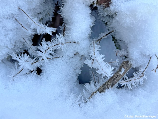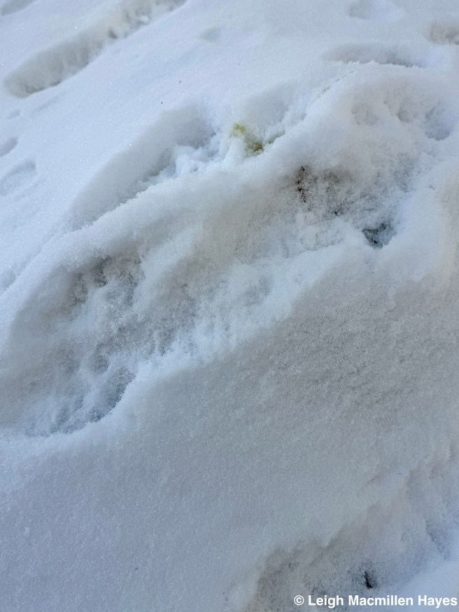 After today’s snow ended and another inch or two had accumulated atop our already winter wonderland world, I donned my boots and cameras and headed out the back door, not really sure where I’d wander. I assumed my findings would be few because the precipitation had just stopped.