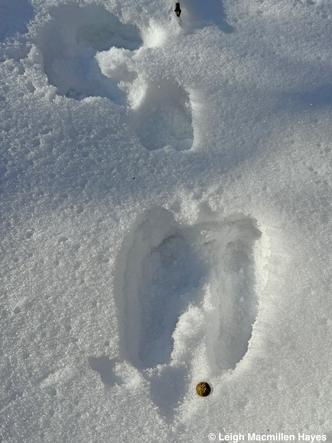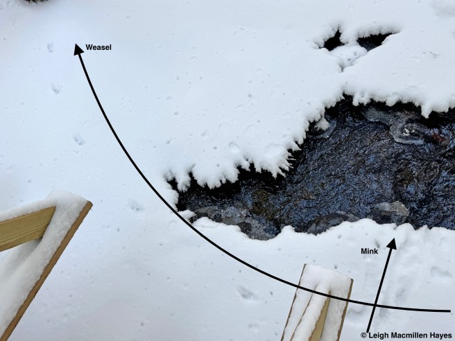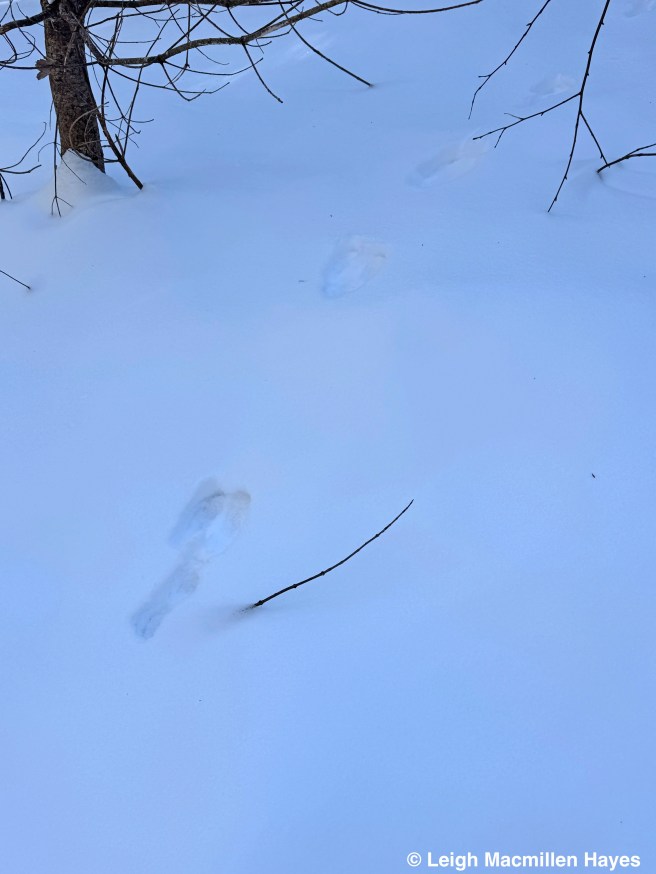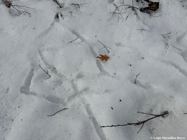 What I can’t figure out is why they are walking on the snow on these cold days, given that their meal of choice is in the subnivean layer between the ground and snow–that being the Springtails, aka Snow Fleas, those little dots of pepper that perform circus acts as they jump around in our boot prints on warm winter days. I have yet to see any Springtails on the snow.