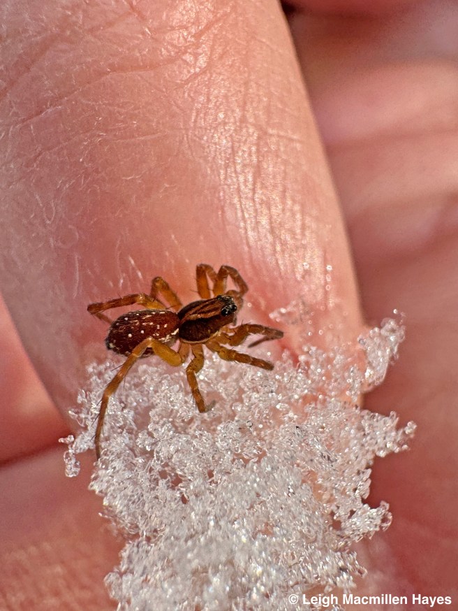 The question is: how does a tiny critter with such a fragile looking body and legs survive in these temps? I’ve read that some spider species can lower their bodies’ freezing point by producing a cryoprotectant, Glycerol, a natural anti-freeze compound that lowers the temperature at which their tissues will freeze.