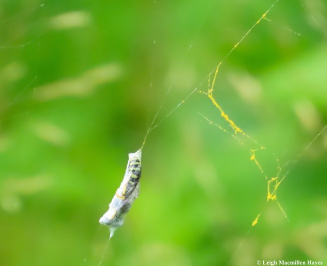 It seems every summer I learn something new from these spiders, and this year I’ve had some time to watch them wrapping their prey on more than one occasion. I’ve also watched as one Bumbler somehow managed to bounce off the web . . . one strand at a time, and fly off. But not all are successful and the spiders need to eat too.
