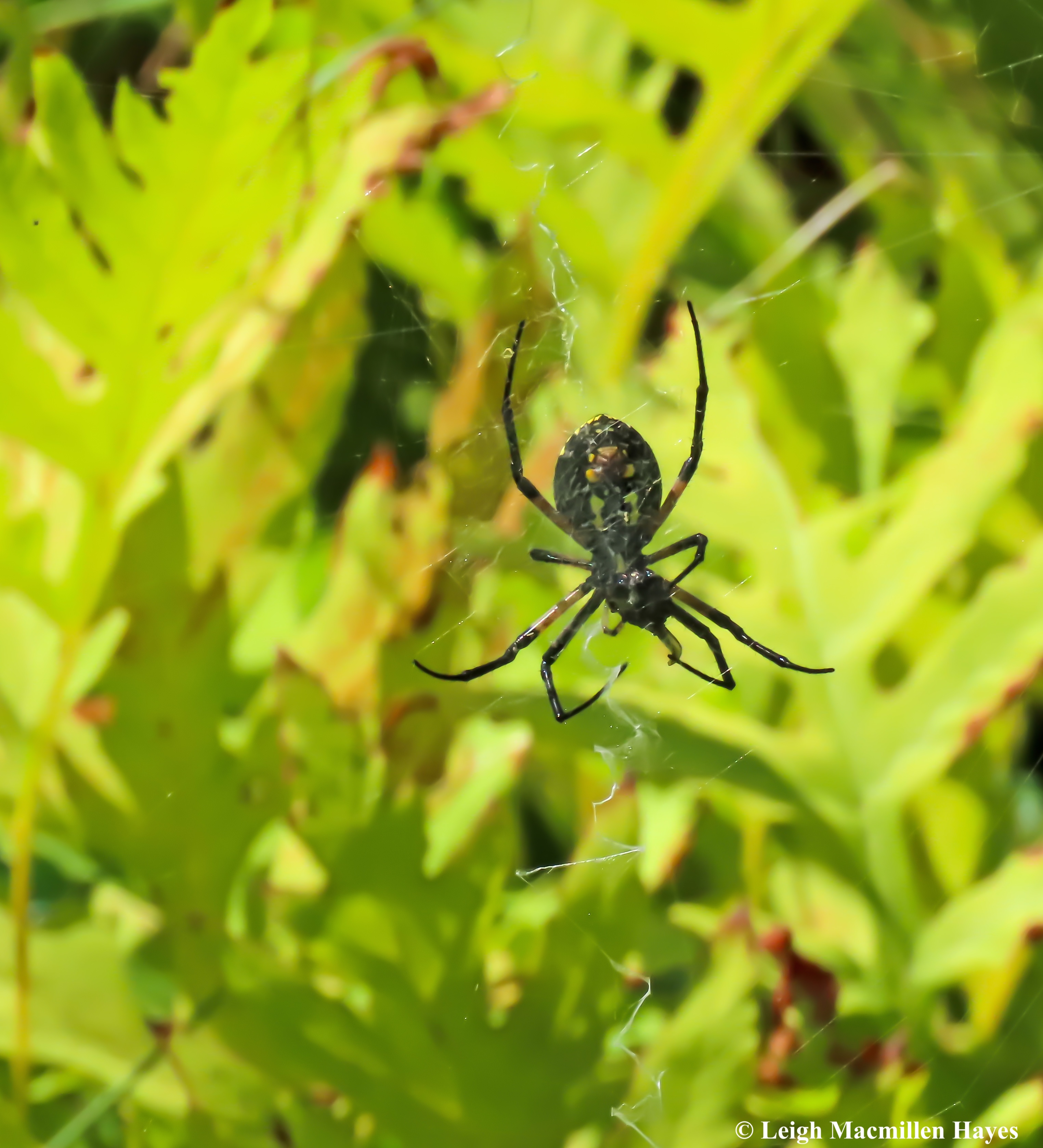 As you get a closer look at C-s, you may question the name. I did. My research turned up the fact that this egg-shaped arachnid can have an abdomen of varying colors from white to cream to green, and maybe even red. As for the stripes, there are those with broad or v-shaped stripes, but also my friend, who sports rows of dark spots.