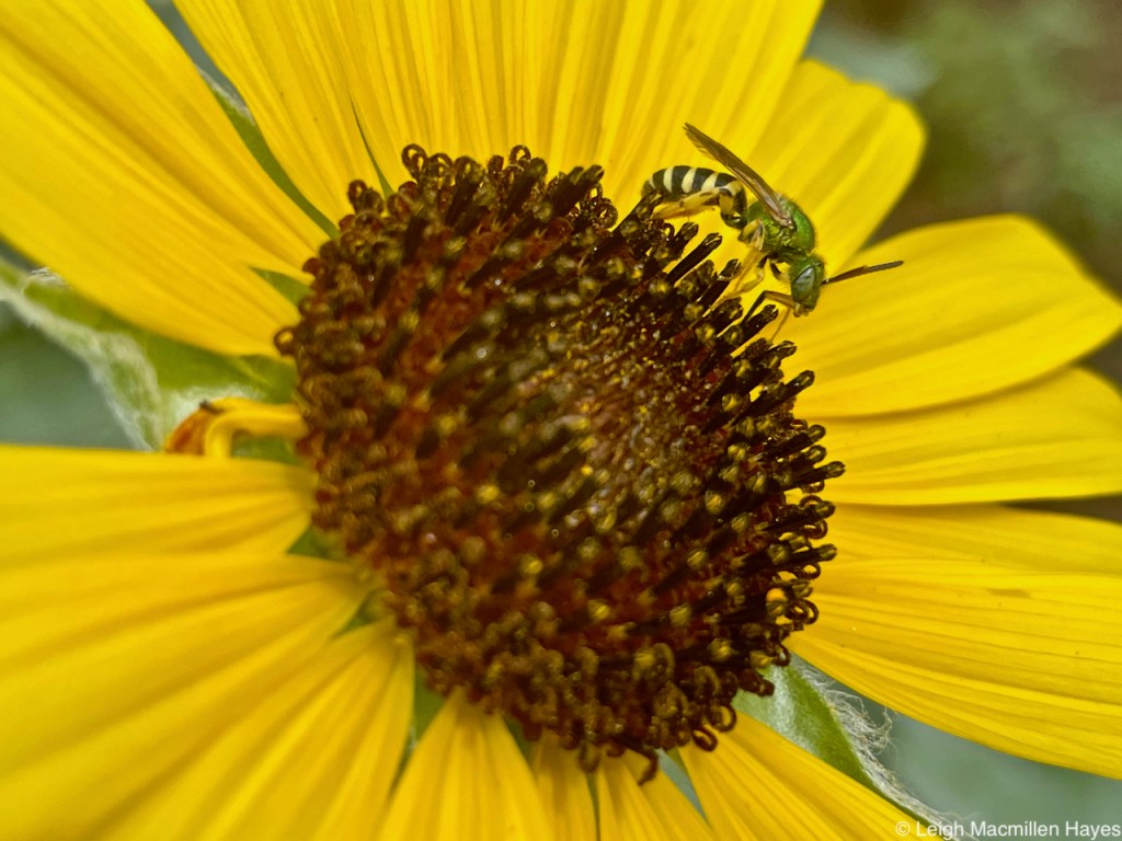 Another insect that tickles my fancy is the Sweat Bee. I’m a goner for that iridescent green head and thorax. While Sweat Bees are common on flowers, such as this tall sunflower, they also are attracted to our perspiration and this afternoon I had one that kept approaching my bare, sweaty feet.