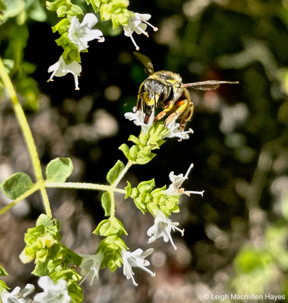 Then there’s this insect. I’ve mentioned that I can stand still and not be bombarded by Bumble Bees, but this Flower Fly that chooses to mimic a bee adds a new chapter to the story. It makes the herb garden come alive with its insistent buzzing and it likes to charge at me as if it is ferocious. Intimidating? Yes. Will it sting me? No. And so I stand my ground.