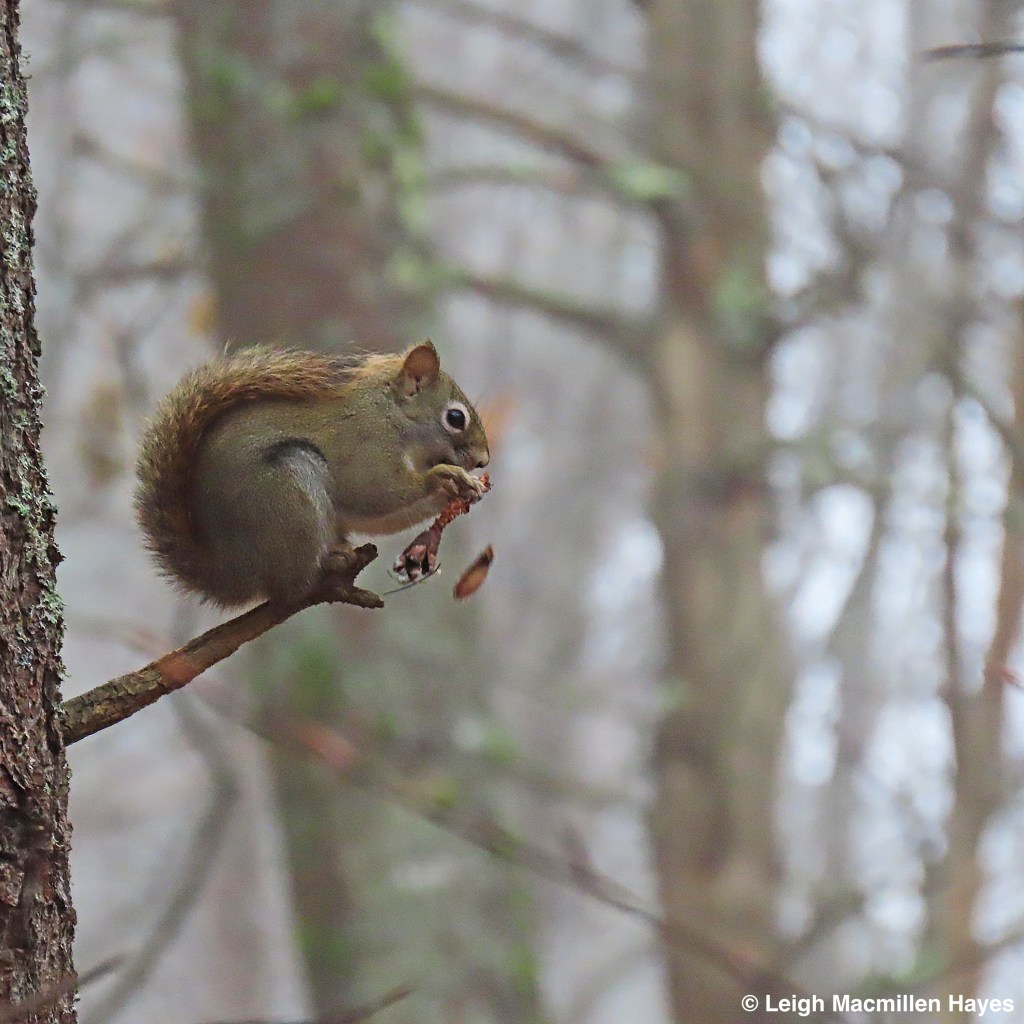 Much to my delight, I spotted Red on a pine branch, a perfect high spot on which to dine and keep an eye on invaders of his domain, such as me. My presence, however, did not stop him from peeling each scale to seek the two seeds tucked close to the cob.