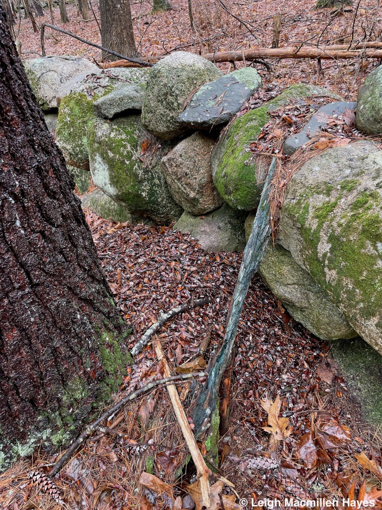 On the other side of the cow path, for that is where the tall pile is located, I realized he’s started another cache, this one located under some discarded garden fence left behind by previous owners of the land. It’s actually a great spot in my squirrely mind, for its beside the wall so he can easily access it from a dry spot within and the fencing and sticks and leaves have created a shelter.