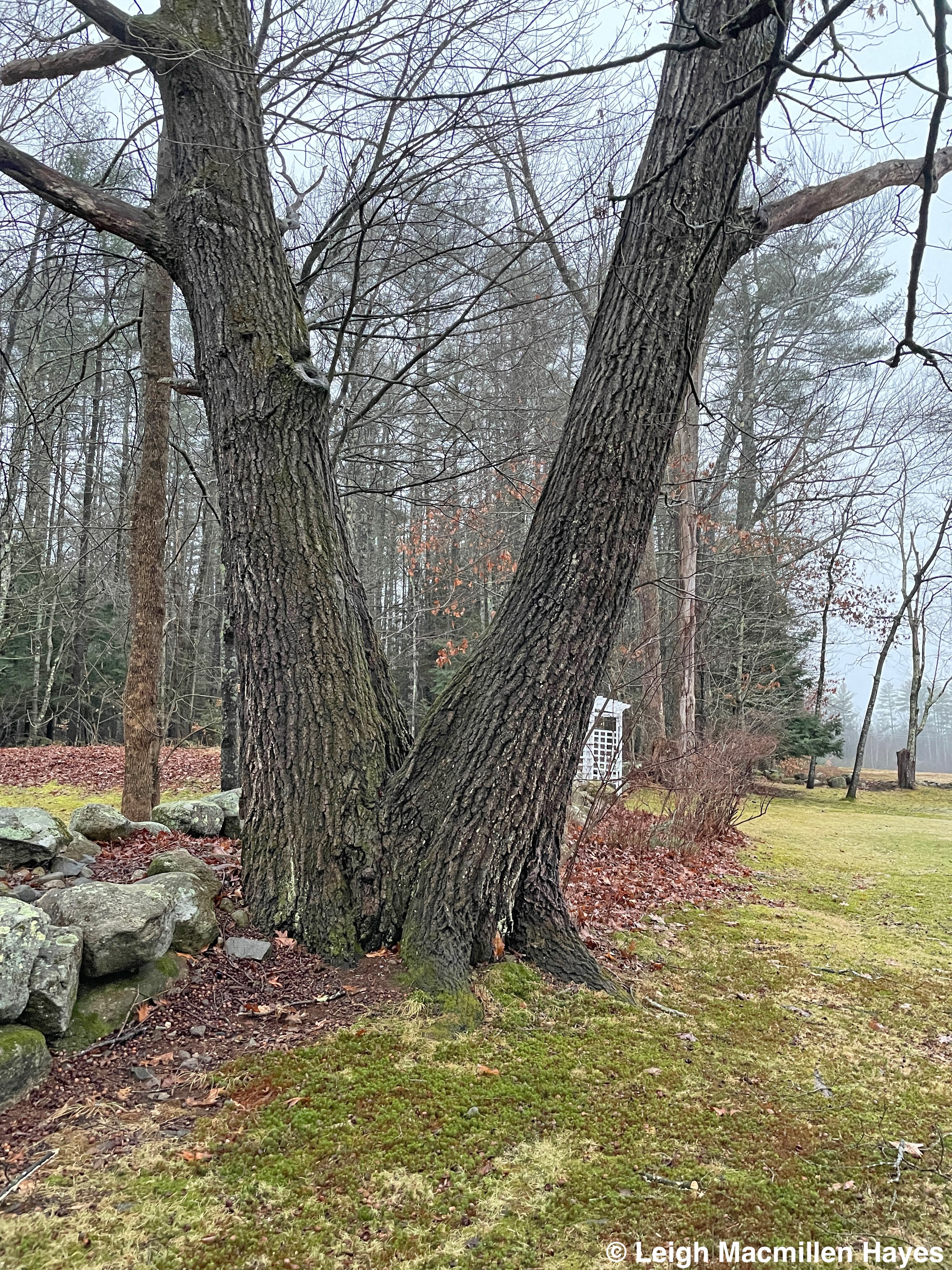The tree behind our barn is massive, with a coppiced base and therefore three large trunks. Our sons once built a fort in that space between.
