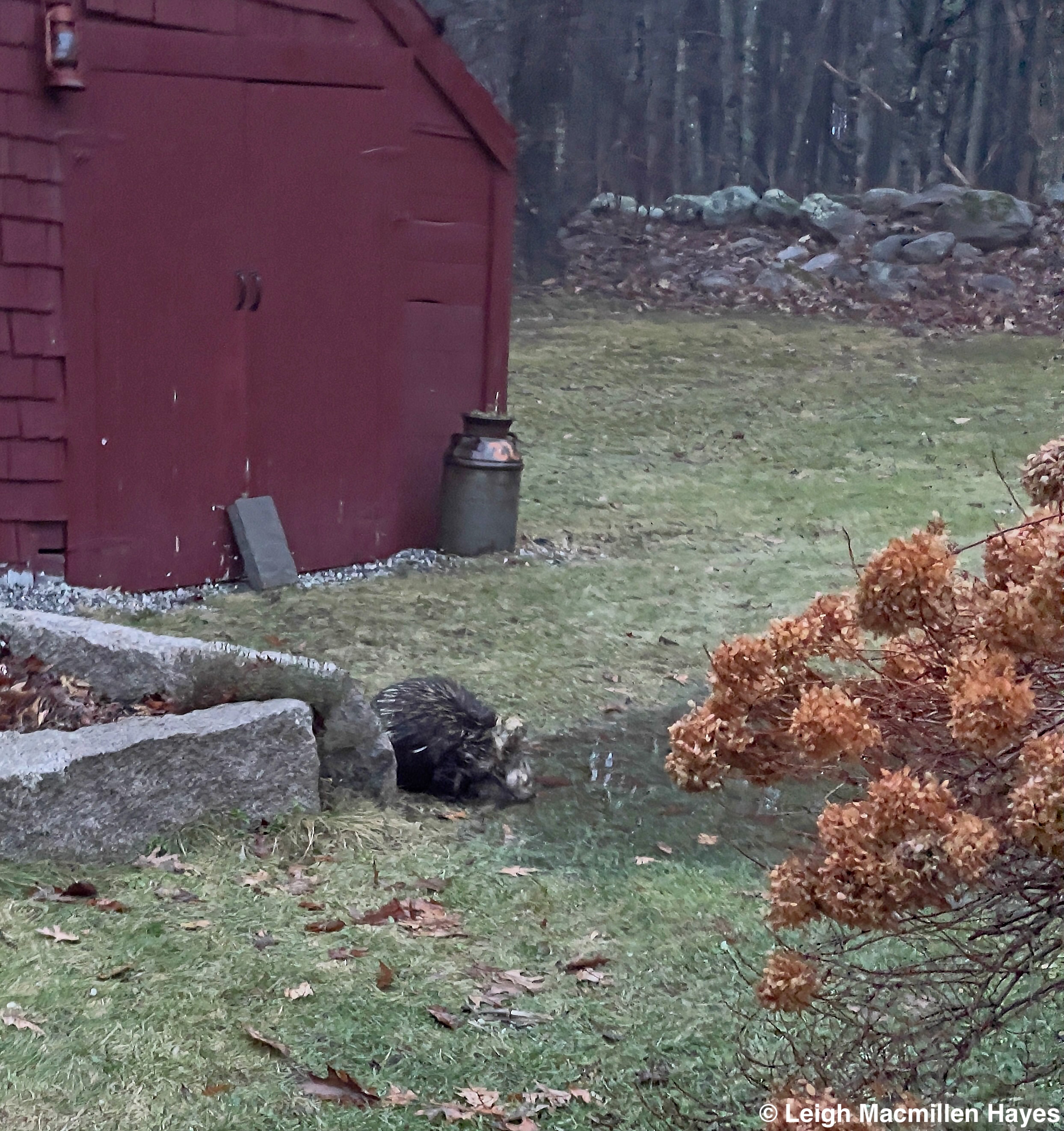 At about 4:15pm the day before, our youngest son, his gal, and I watched Bandit, the local porcupine come from the acorns to a puddle beside the herb garden and pause for about five minutes as he sipped from it. That was another first for me. And them as well. In fact, for his gal, just seeing a porcupine in the wild was a first.