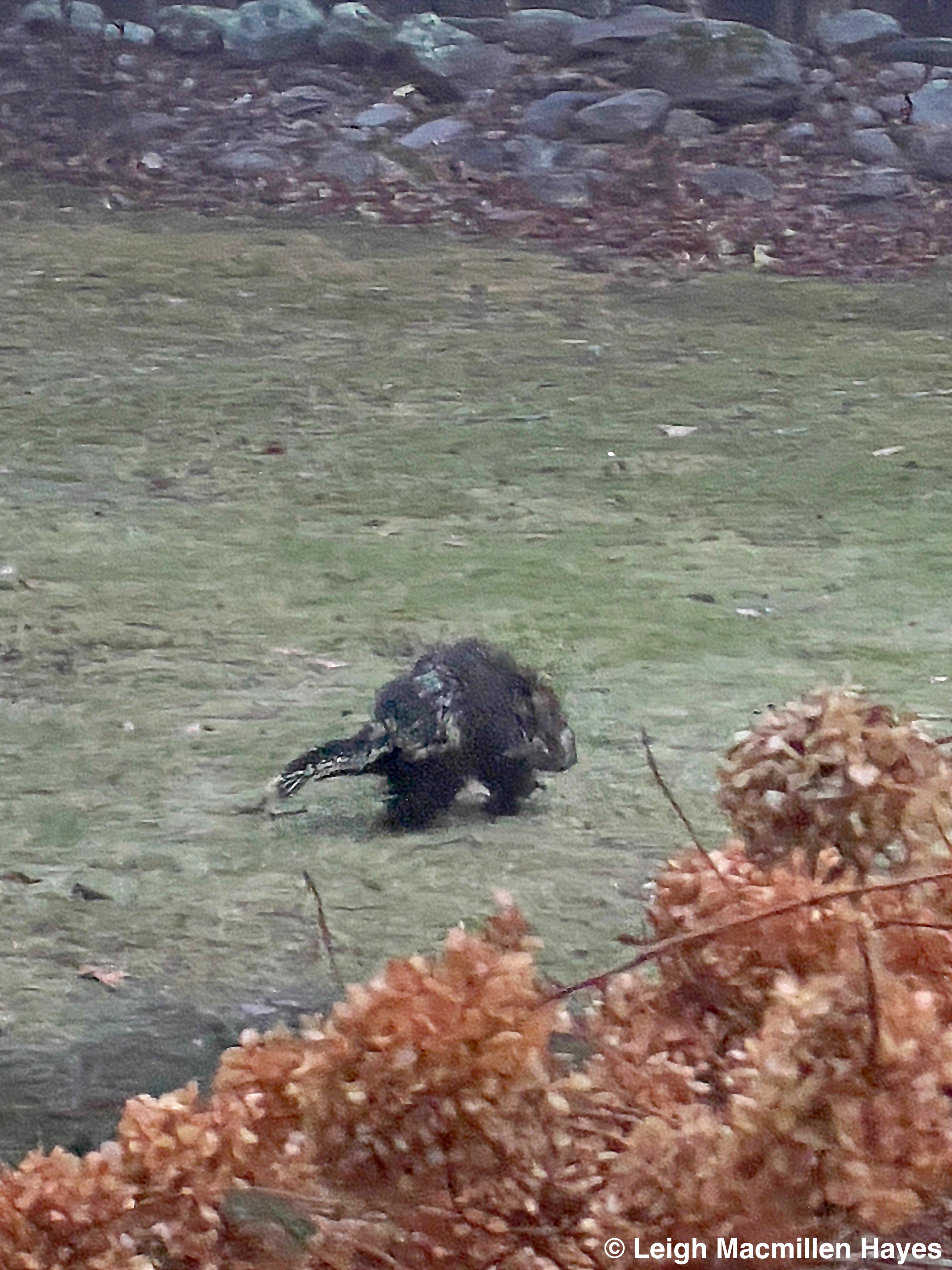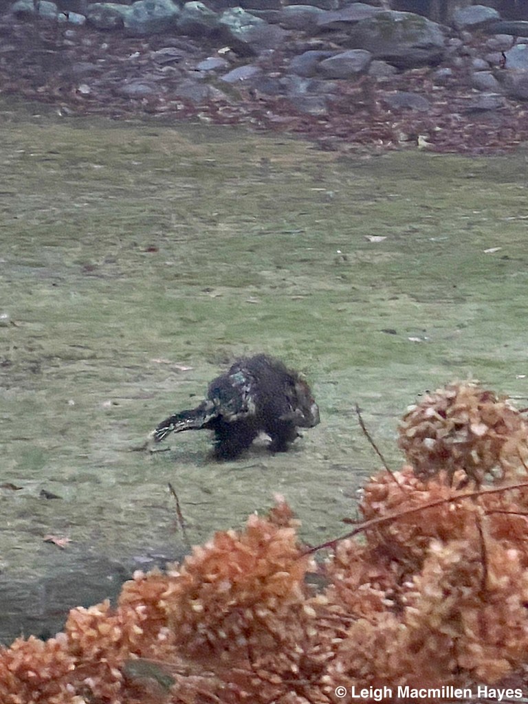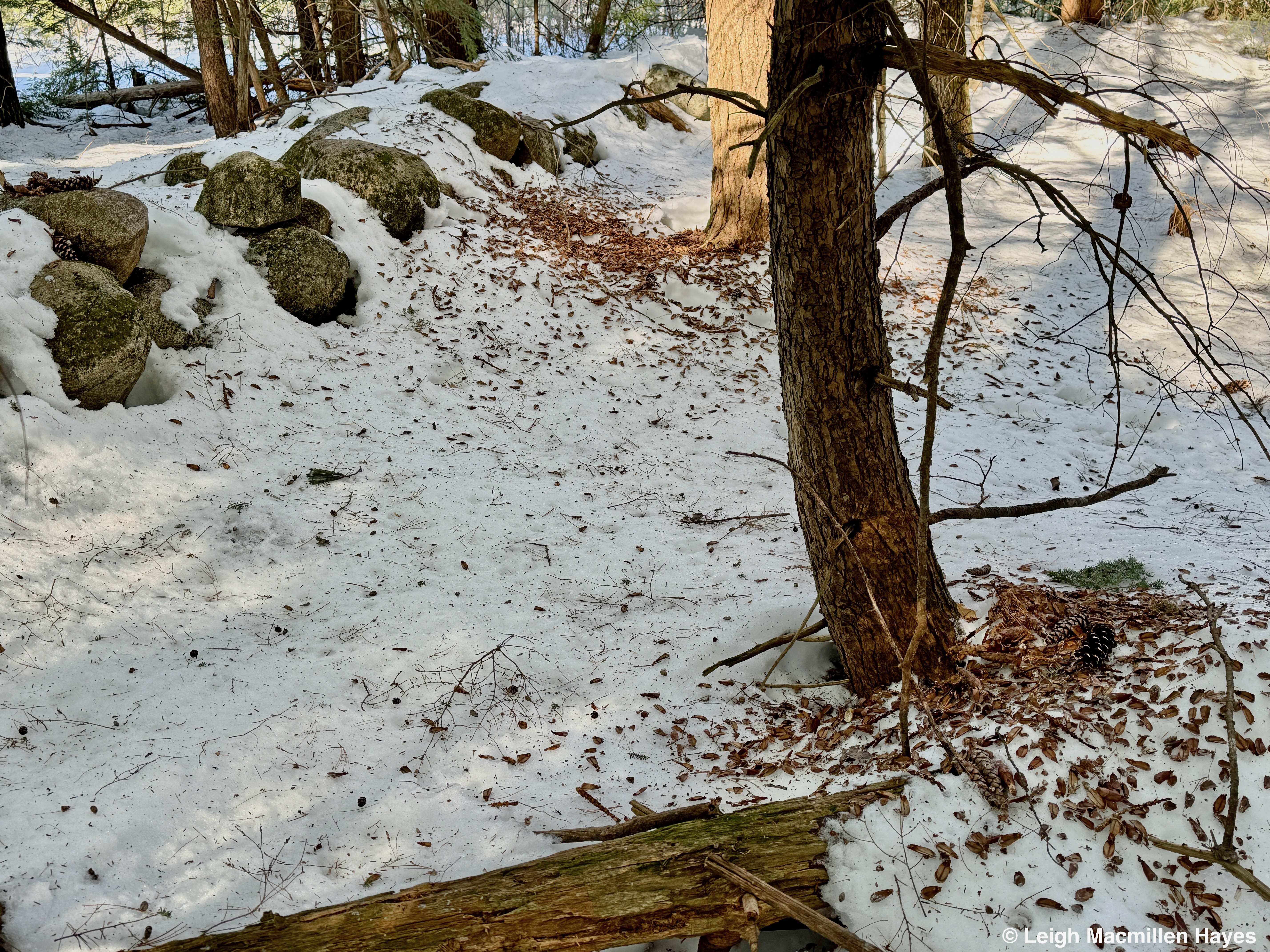 Then he waddled off to the woods on the other side of the stone wall, and probably found an Eastern Hemlock upon which to dine for the night. I found a few trees with downed twigs, but none that cried out, “I’m Bandit’s food source,” so I suspect I need to expand my search on another day.