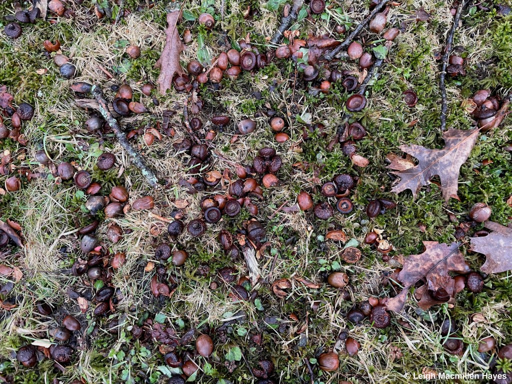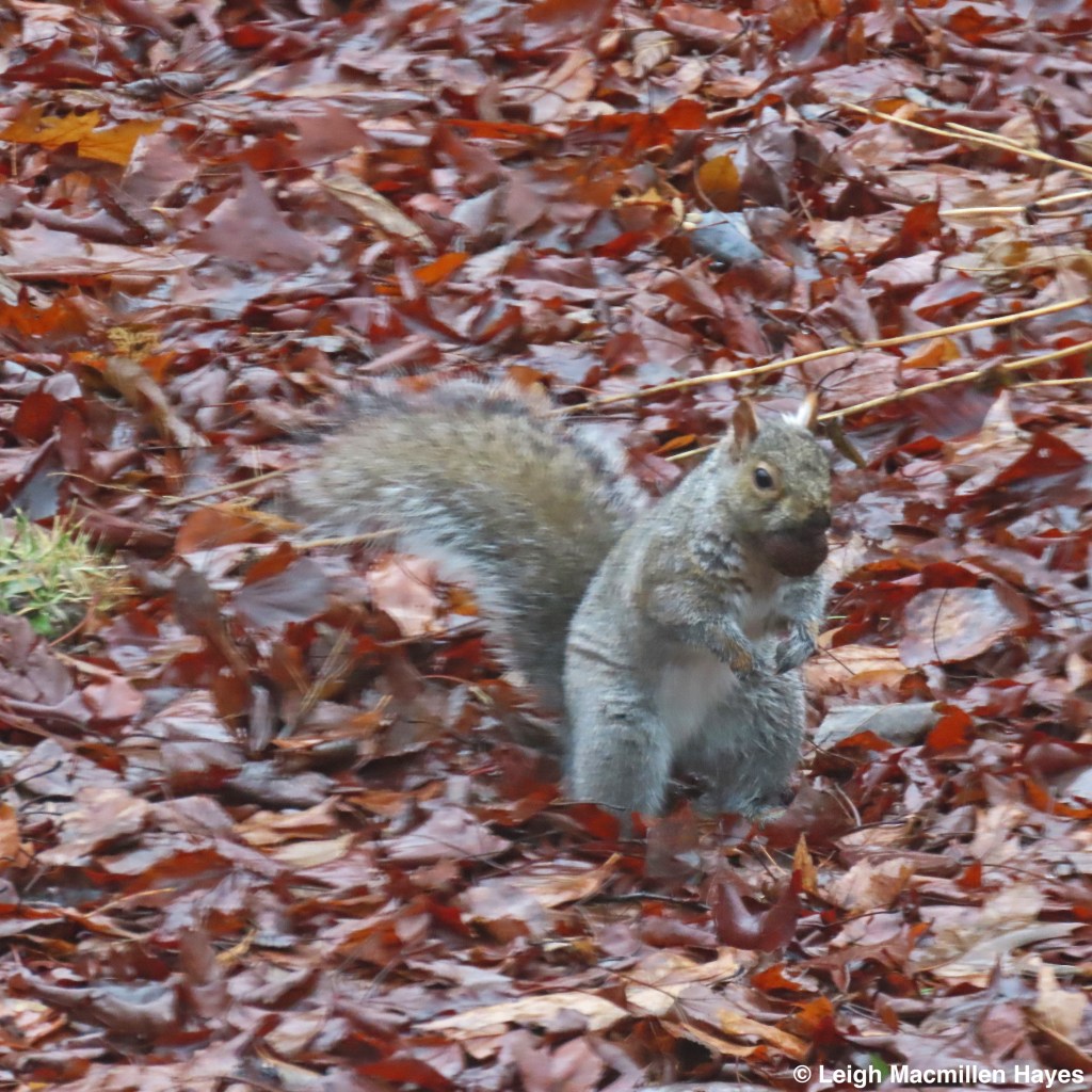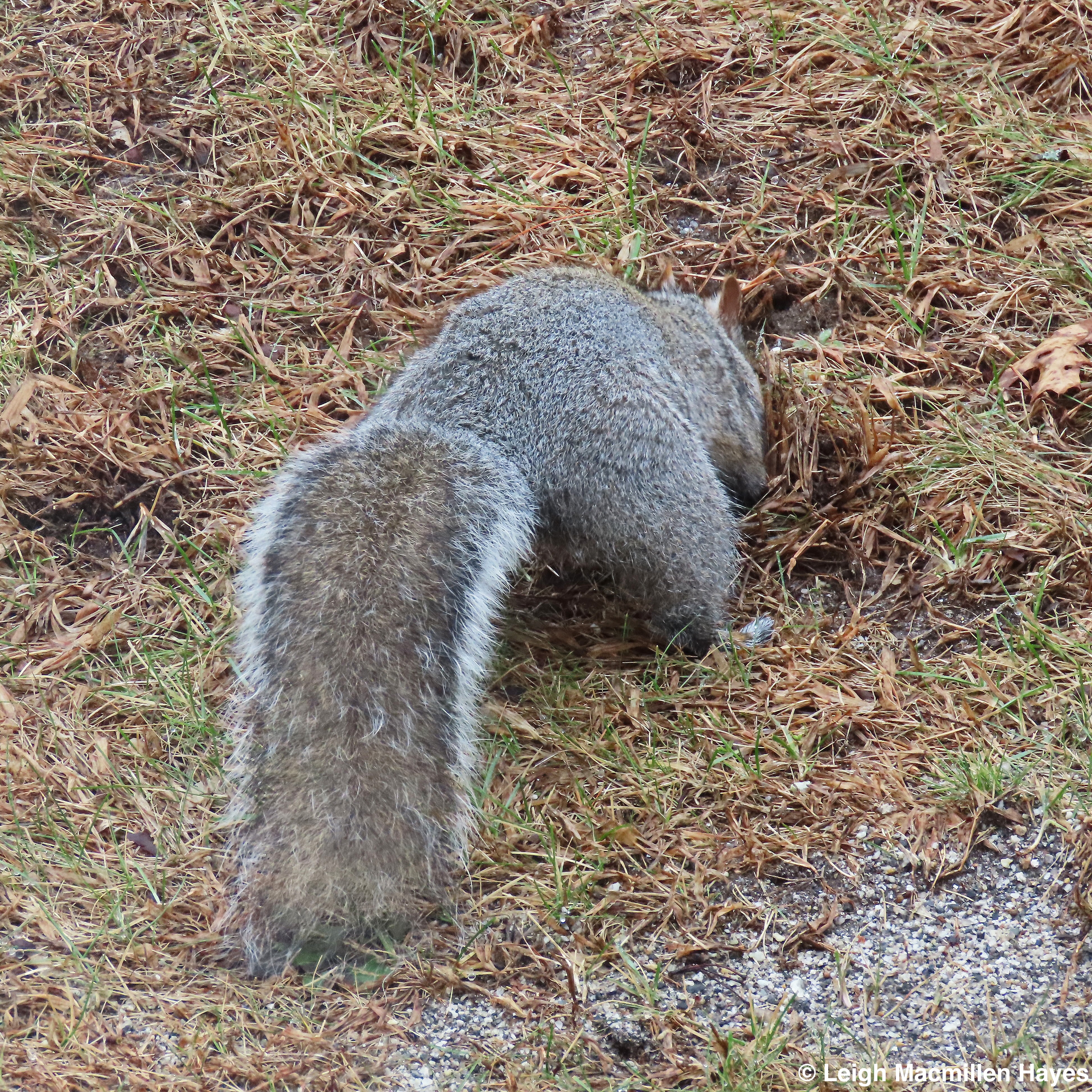 I realized I’ve never paid particular attention to a Gray Squirrel caching acorns, one here, one there, for future food sources, or a future oak sapling if not dined upon. I knew they did that. But what I didn’t realize is that much consideration goes into location of said single cache. The squirrel moved through two gardens, across the yard, and paused about three feet from the back door to dig, all the while holding the acorn between its lips.