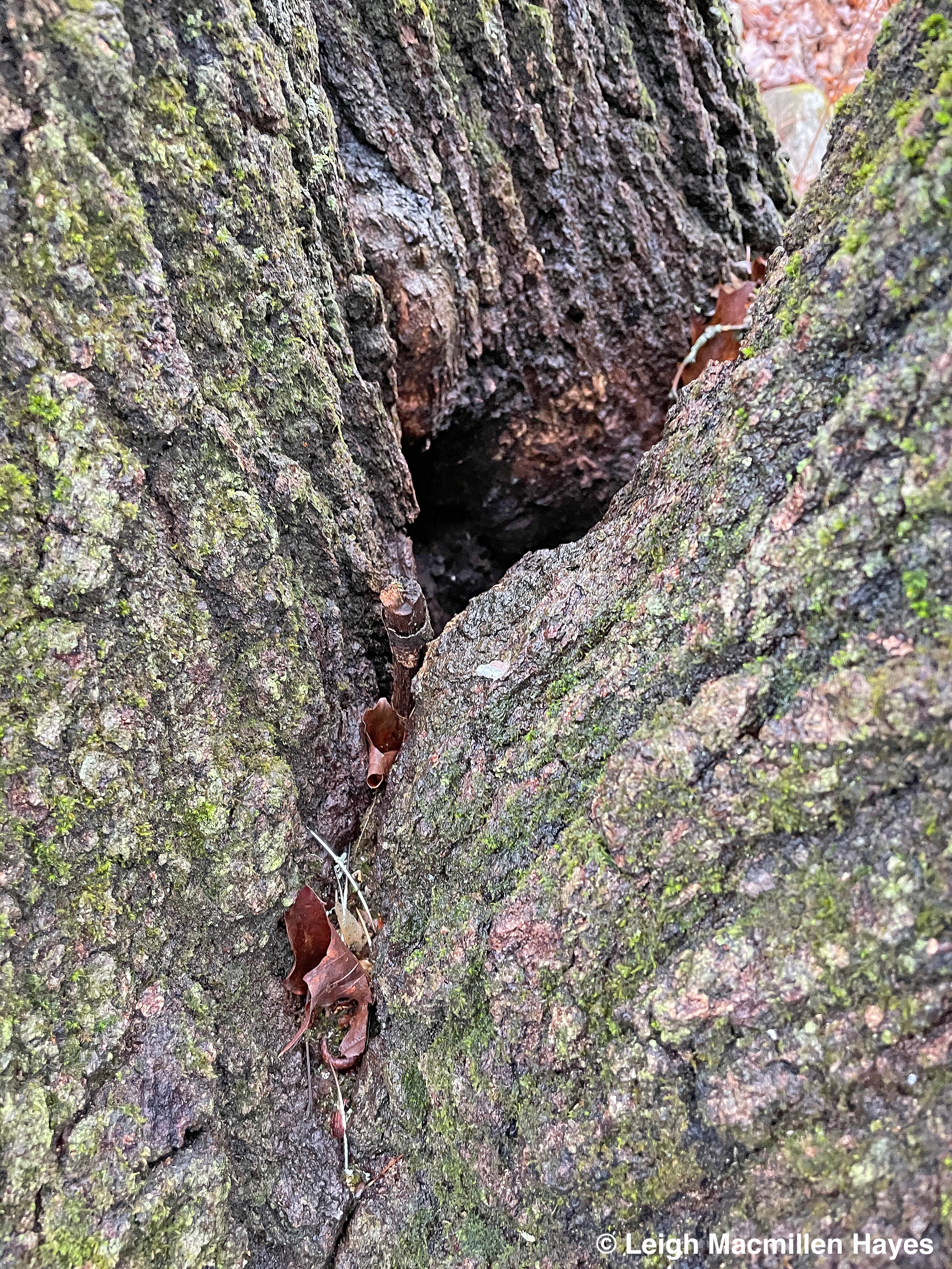 Instead, I made a different discovery. We know that Bandit has spent time under the barn, and he’s left tracks when we did have snow that led to a neighbor’s shed, but I have wondered about the old oak tree and the hollow within its three trunks And today, I spied evidence that he has inspected the hollow. Do you see it?