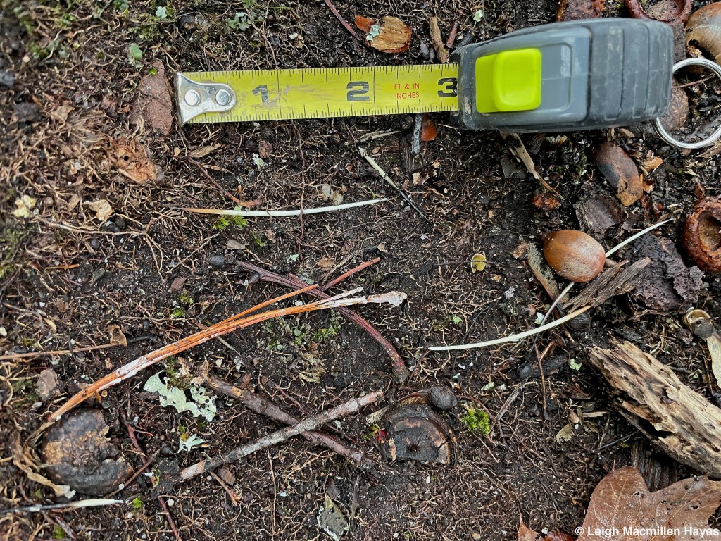 About two inches in length, and some were longer, I love how his brownish hue is similar to that of the bundle of dried pine needles.