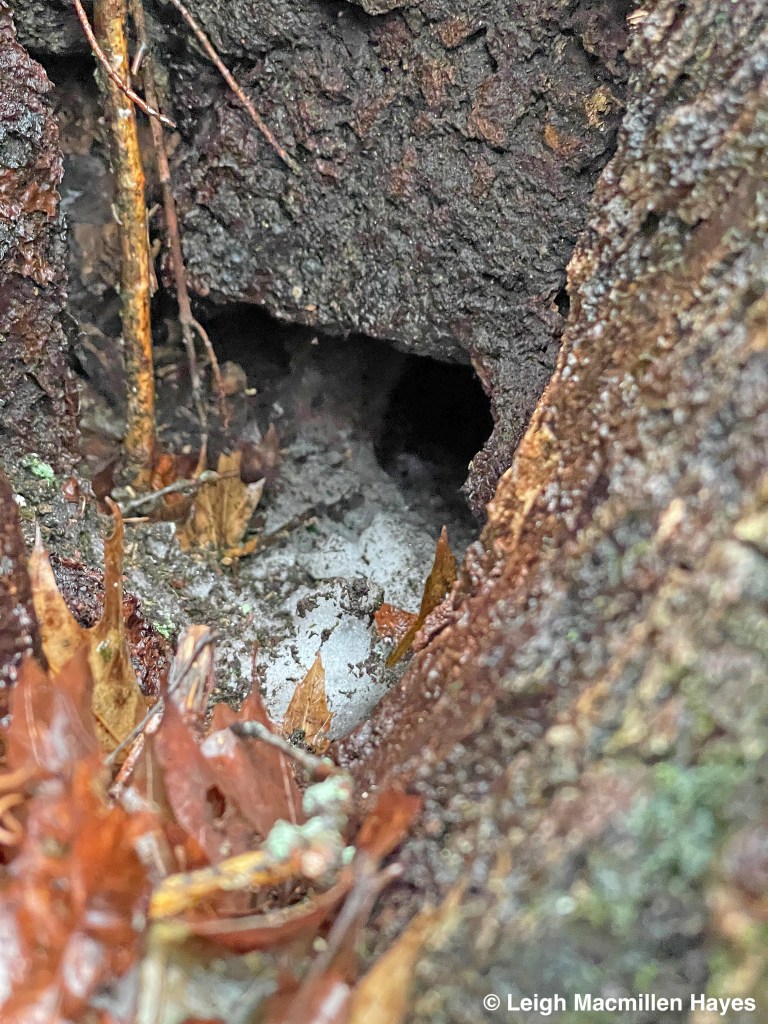 The hollow is dark and deeper than my camera could see. The curious thing is that there is no scat. Yet. You can rest assured that I will keep an eye on this spot.
