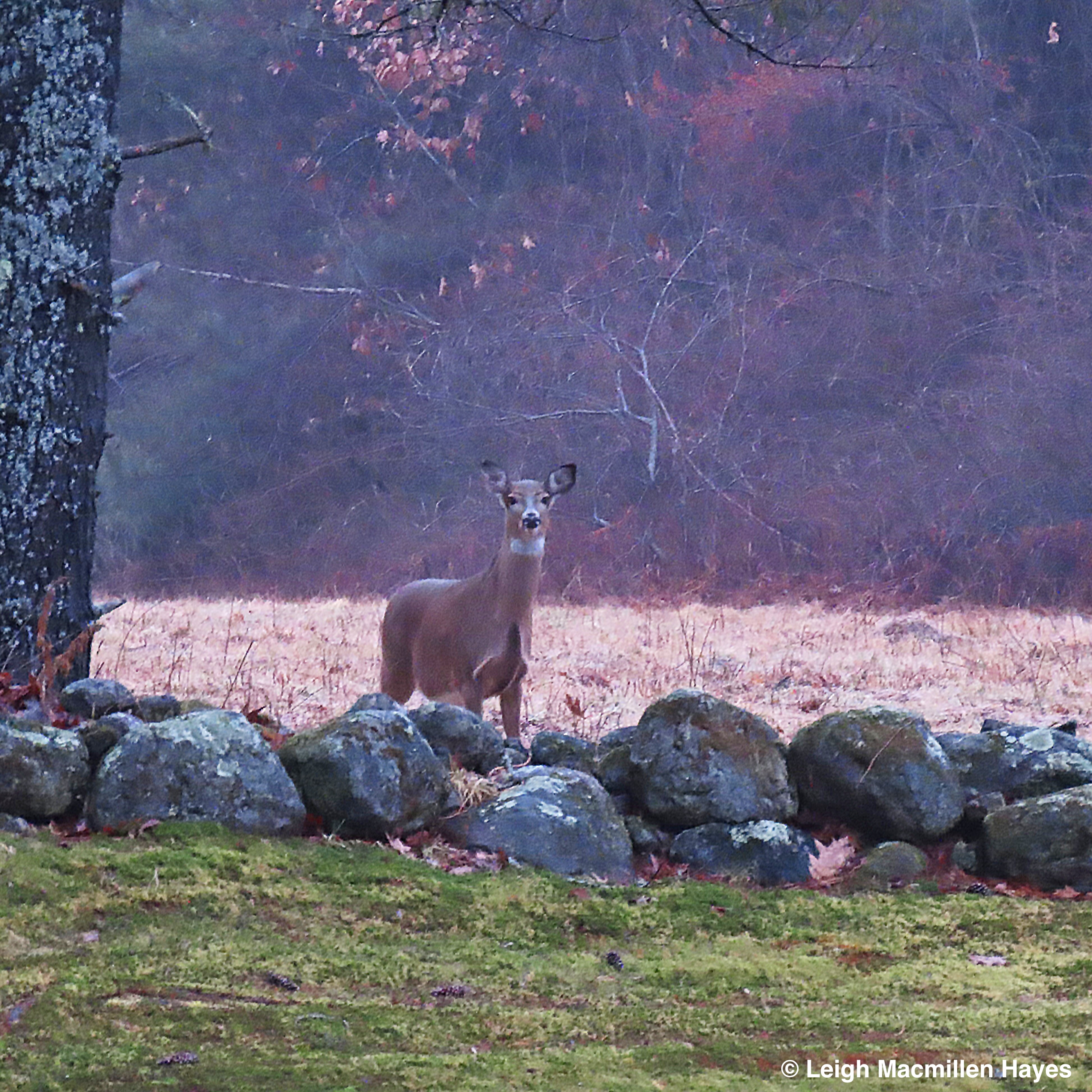 Here’s the message: “Daily we have three deer come into the yard because now that there is snow on the ground, they can’t get to the acorns so easily, but do love the sunflower seeds by the bird feeders. It’s a doe and two skippers. On Thursday I saw another doe with them. And then, as I was finishing up writing the tree blog, Becoming Tree Wise, late afternoon yesterday, I saw two by the feeders and two about 20 feet away. A doe and a skipper in each set. The doe farther away was licking the butt of the skipper. At least that’s what it looked like she was licking from my desk. For minutes on end. And then the other doe and skipper approached them and got quite close. The second doe nudged the first and the first jumped away, paused and then headed back over the stonewall and into the woods. The second doe and two skippers remained close to each other and then I noticed the second doe was bent over. I was trying not to move because even though I’m inside, they hear me and startle easily. I finally grabbed my binoculars and realized the doe was licking the underside of the skipper. I have never seen this before. Have you? Two does bathing a youngster? And at this time of year?”