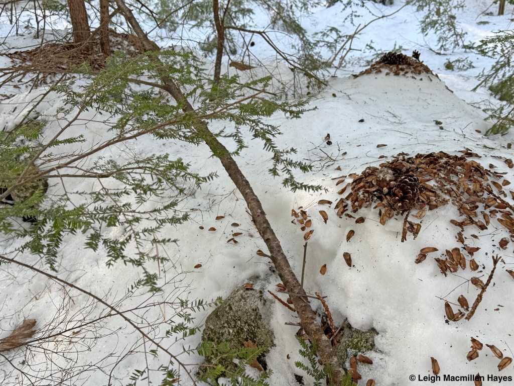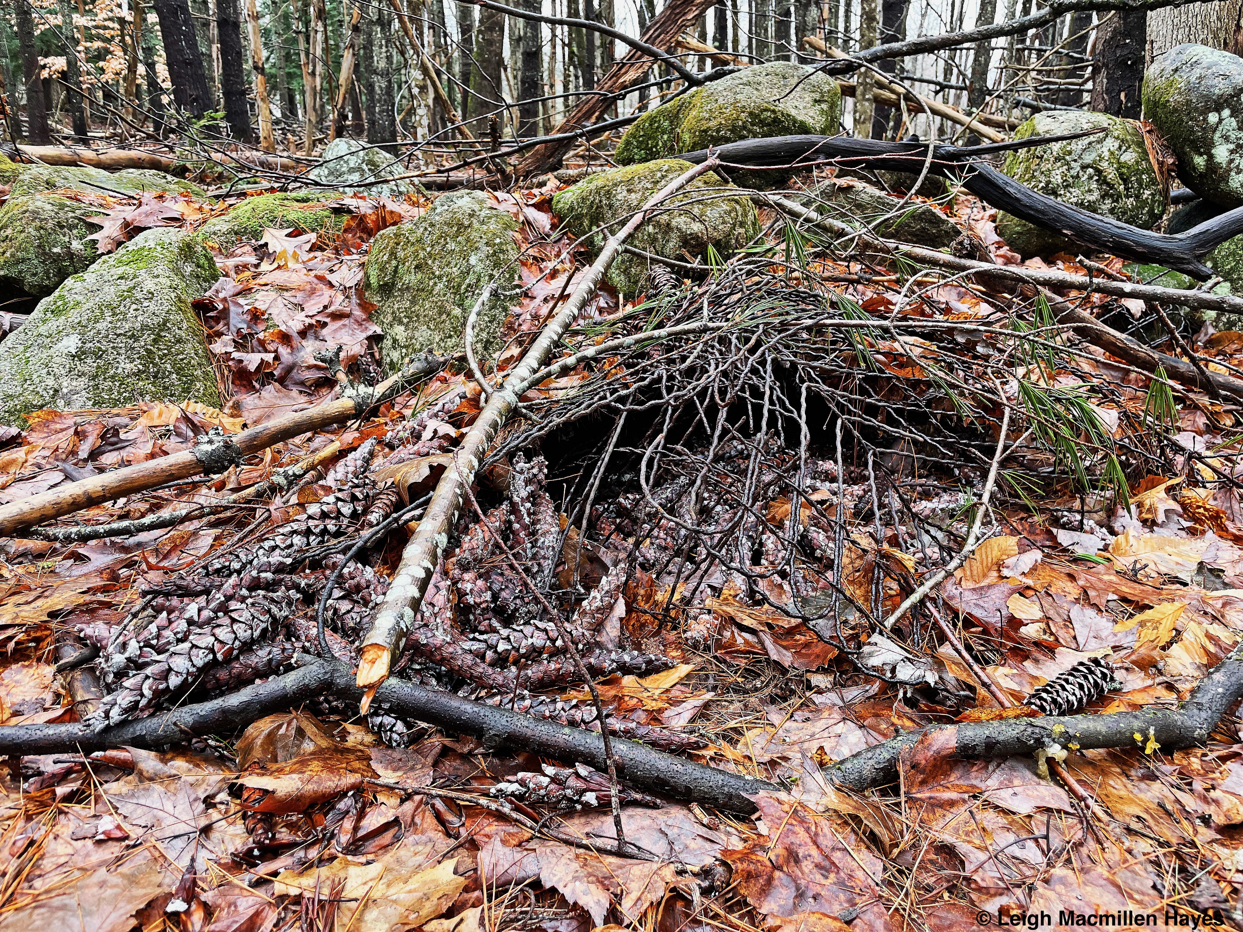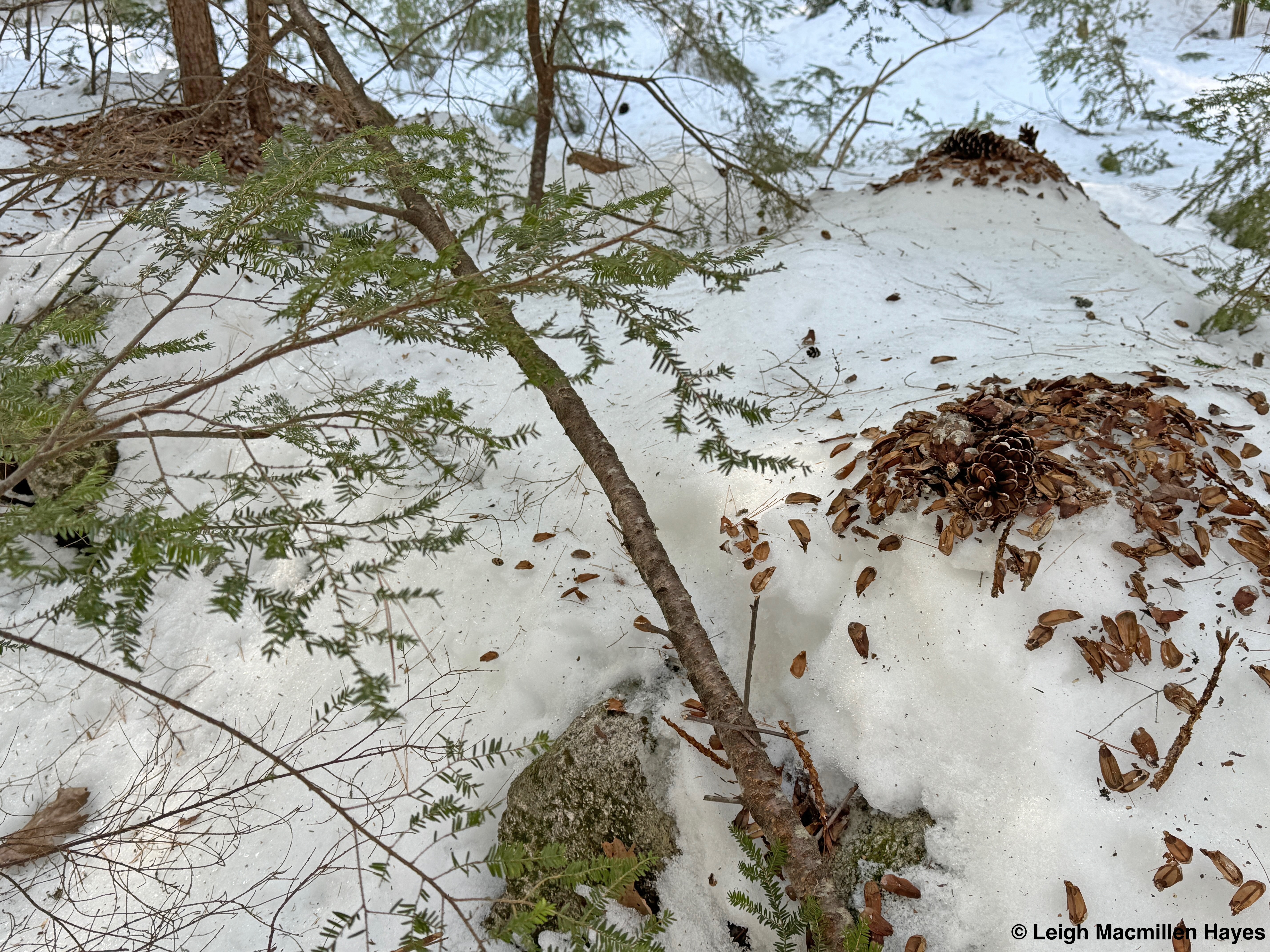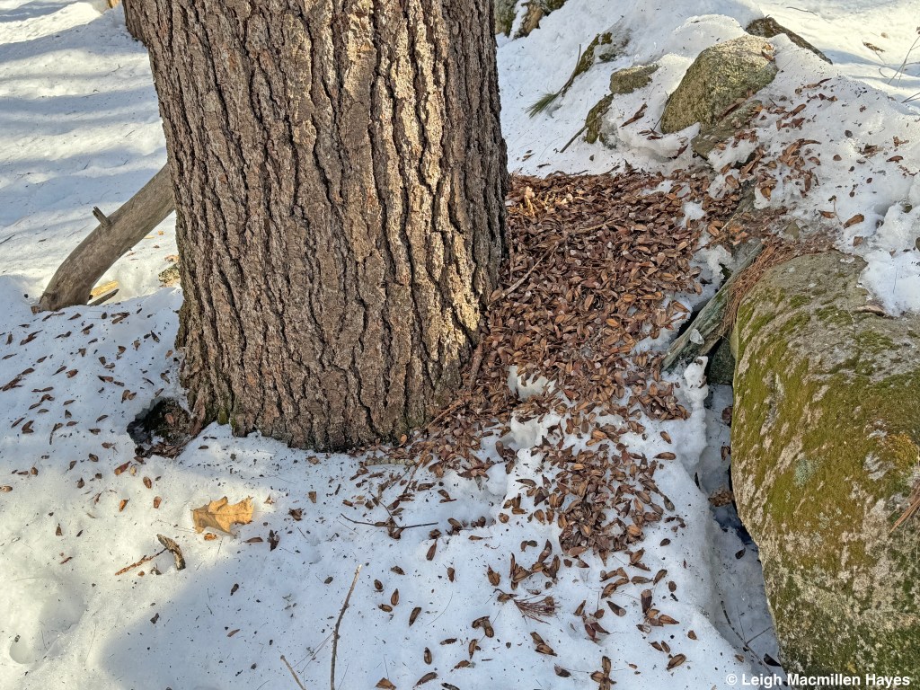 The base of the tree shows just how many scales he’s discarded over the last few months as his midden contiunes to grow. Considering this year was a mast pinecone production year for Eastern White Pines in western Maine, this is one well fed squirrel.