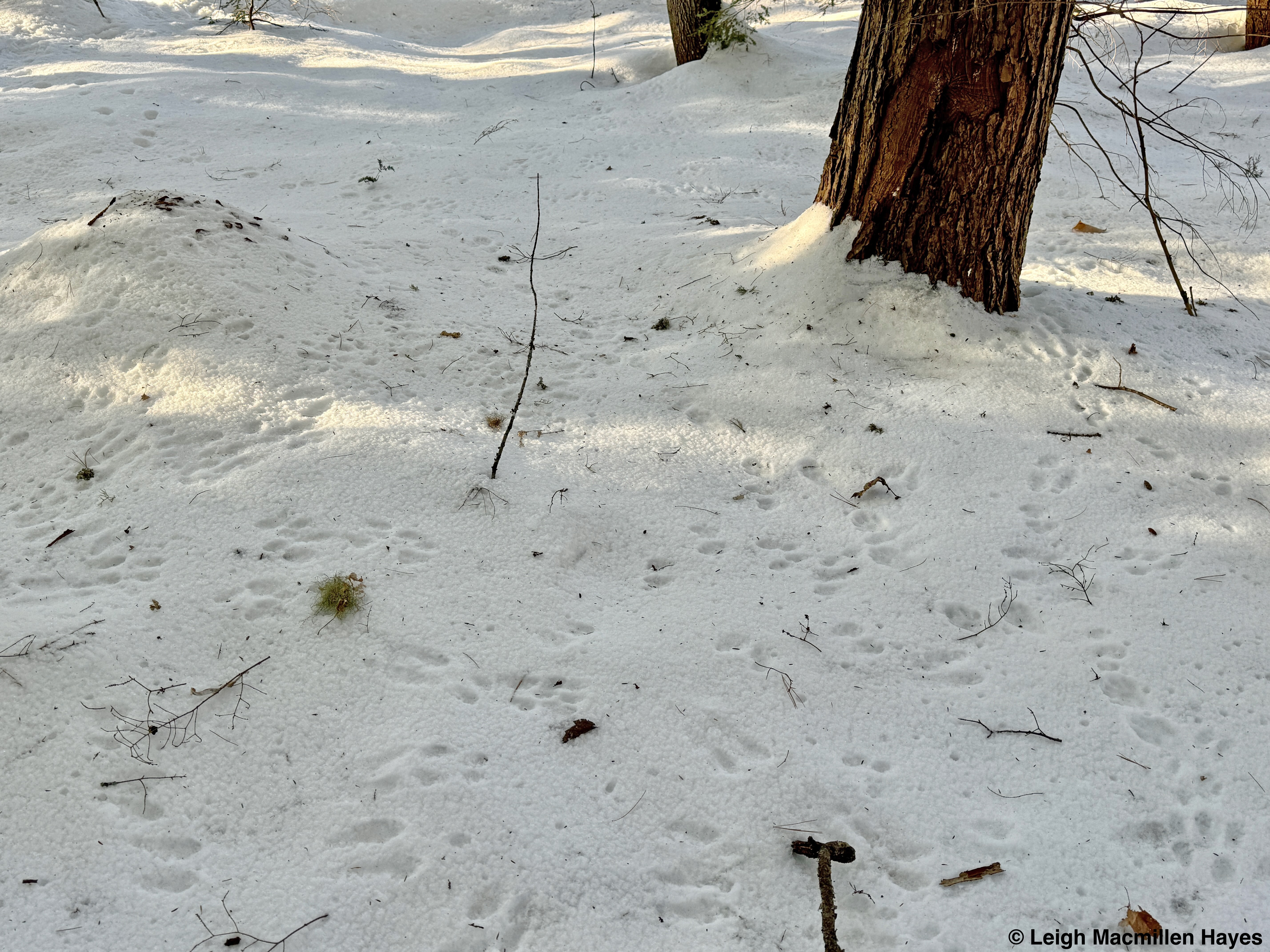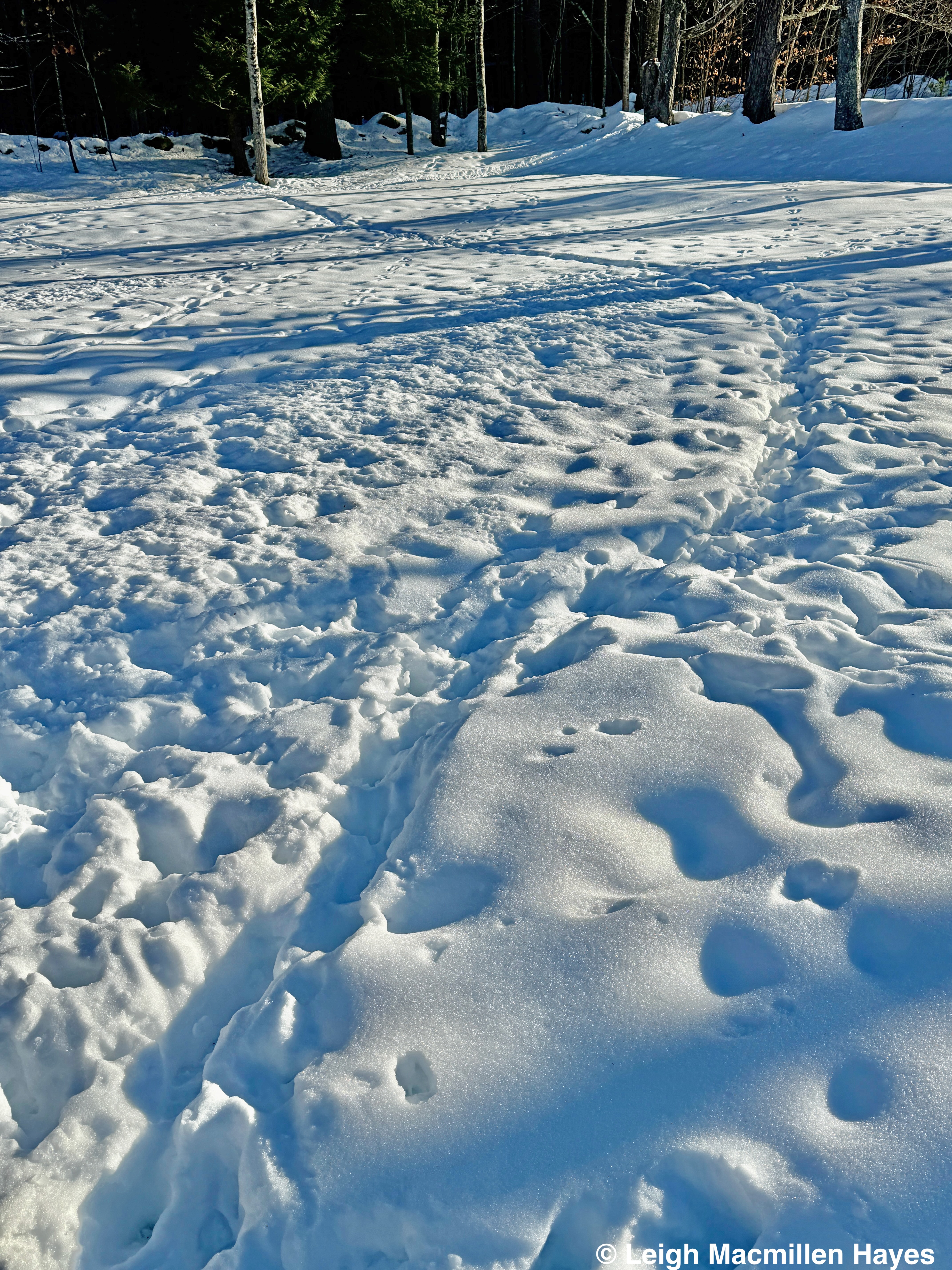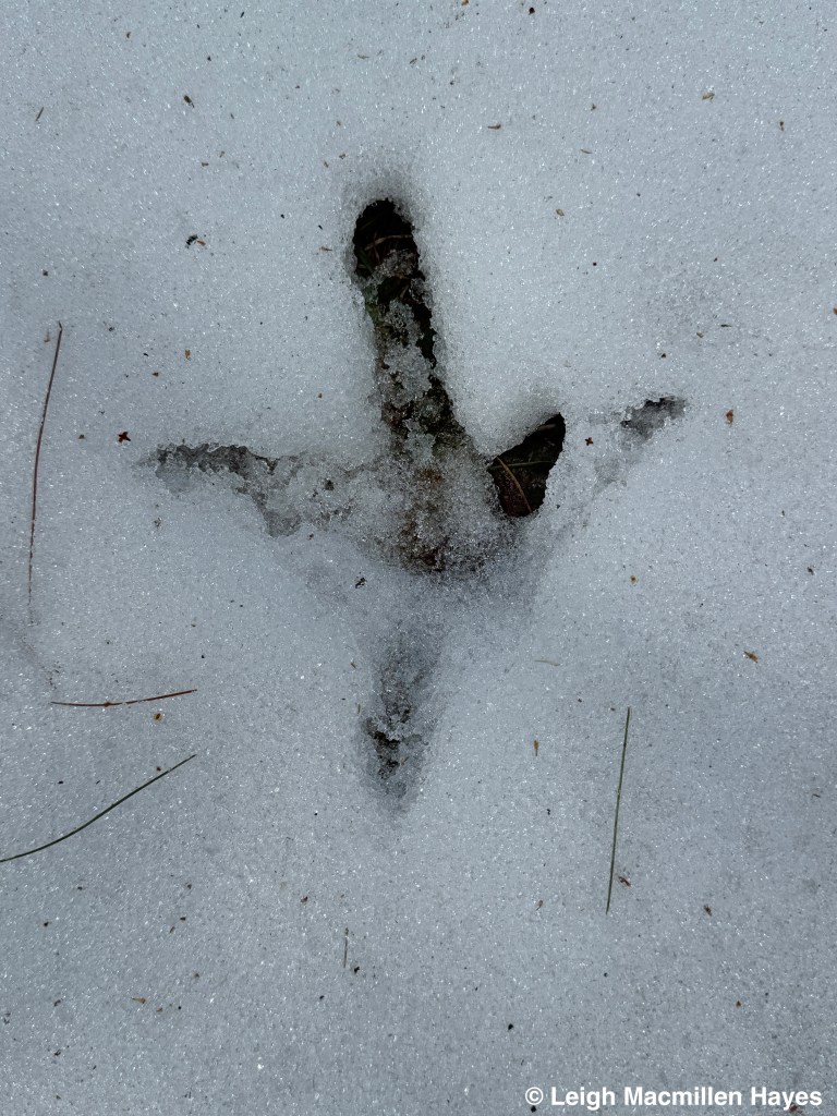 Eventually I moved on, and the next beauty to share a sign of its presence in these woods was a Snow Lobster, aka Snowshoe Hare. Remember, the two feet at the top of the photo are actually the hind feet, while the two behind, that form the lobster tail, are the front feet–as the hind feet swing around the front and land as this hopper leaps forward.