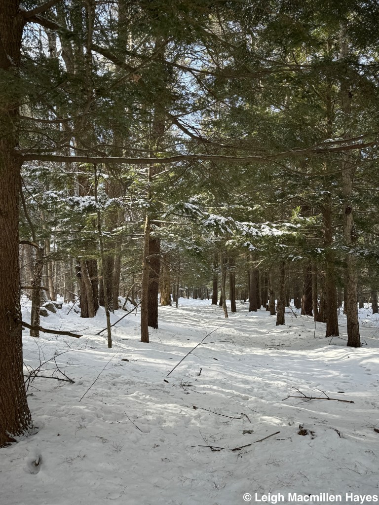 It is here that I discovered Snowshoe Hare tracks and my heart smiled again. There’s not much on this portion of our land for the hares to dine upon, such is the landscape when the trees block undergrowth. But on either side of the walls, there’s plenty available to them in areas that have seen timber cuts within the last twenty years.