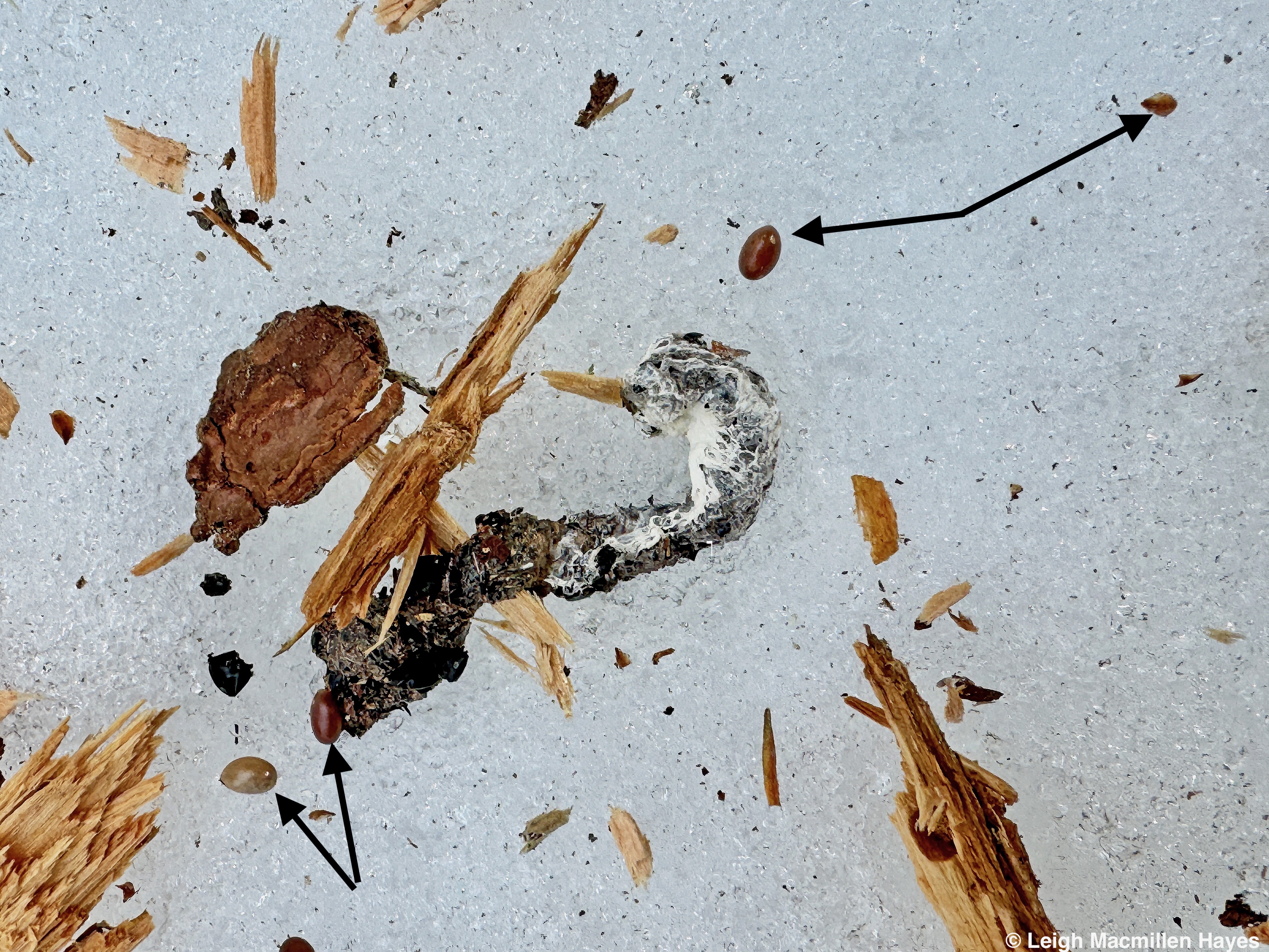 Discovering the tiny seeds the squirrel consumes would have been enough, but there was more. In one section of this squirrel’s habitat we found numerous mushrooms upon branches, placed there by the rodent to dry. Talk about being in a food pantry.