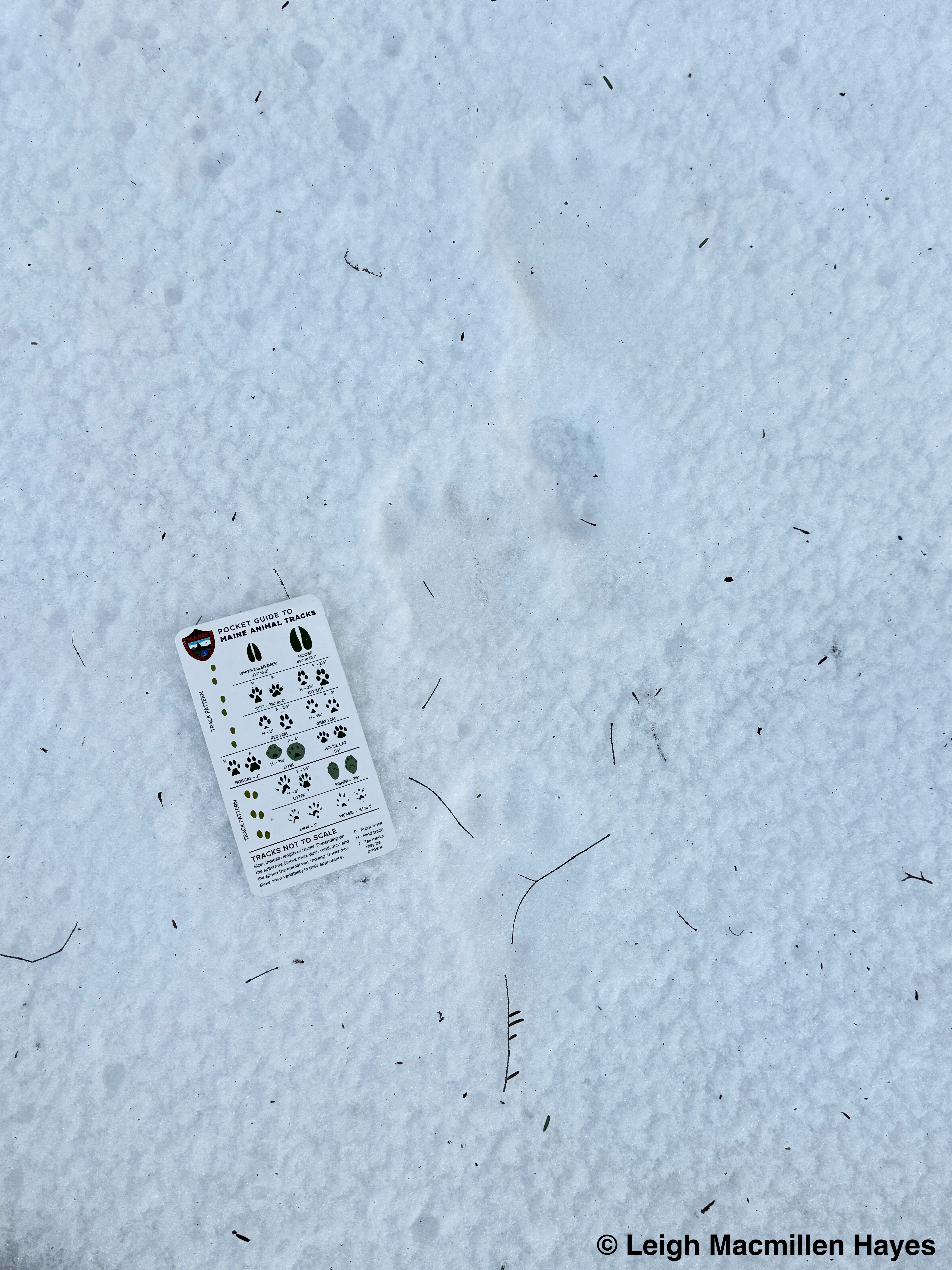 Because I was traveling light, I only had my Maine IF&W card in my pocket to offer a sense of size. But a closer look revealed that this particular trail included the Otter(s) moving in opposite directions, again at different times due to the clarity or non-clarity of the prints.