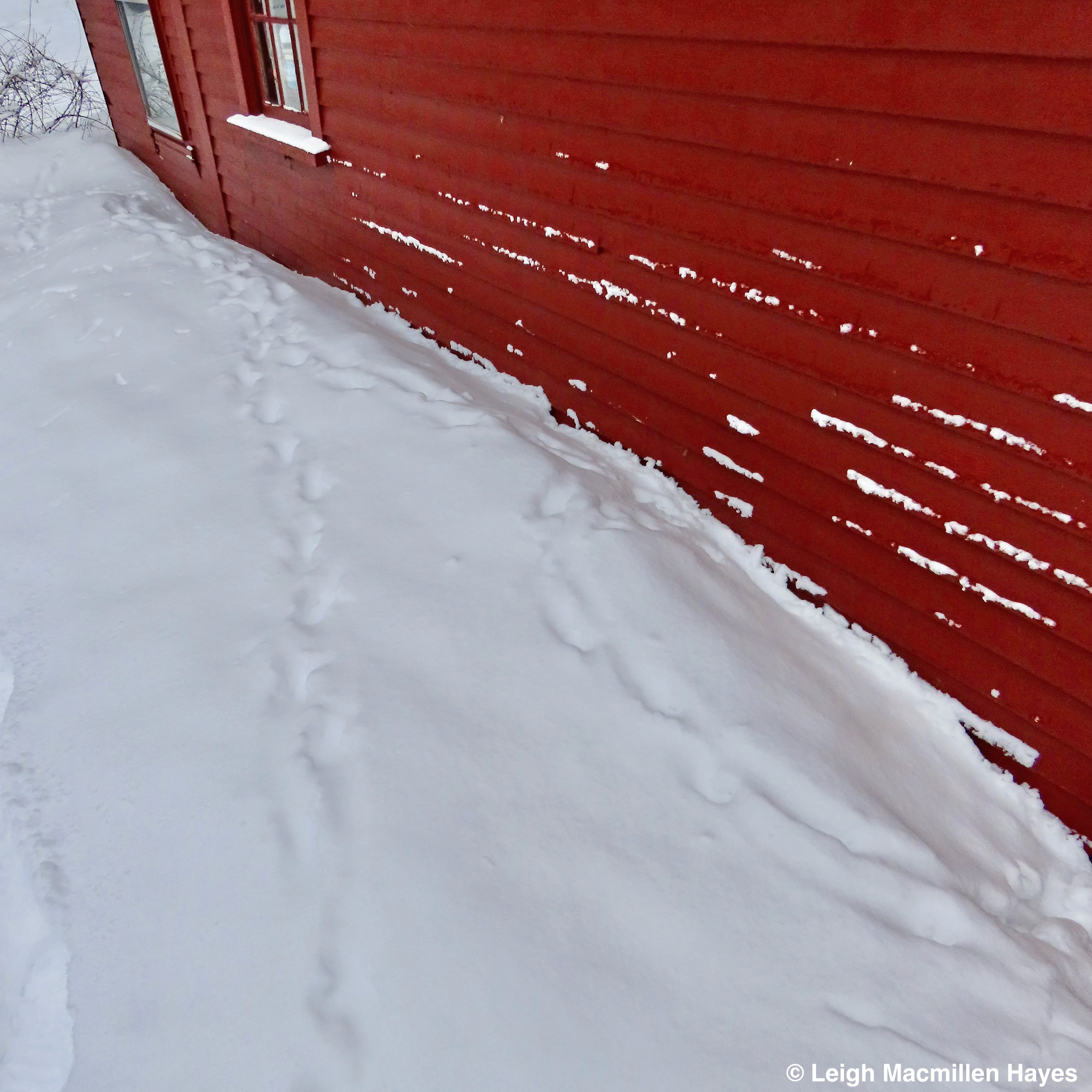 About a month ago, when we did have snow, I discovered blood beside her tracks on this side of the wall and knew that she was in estrus. A day later, I noticed a young buck in the field and by the way he kept his nose to the ground and moved frantically, I knew he was on a mission to find her. Did he? Is she with child? Only spring will tell.