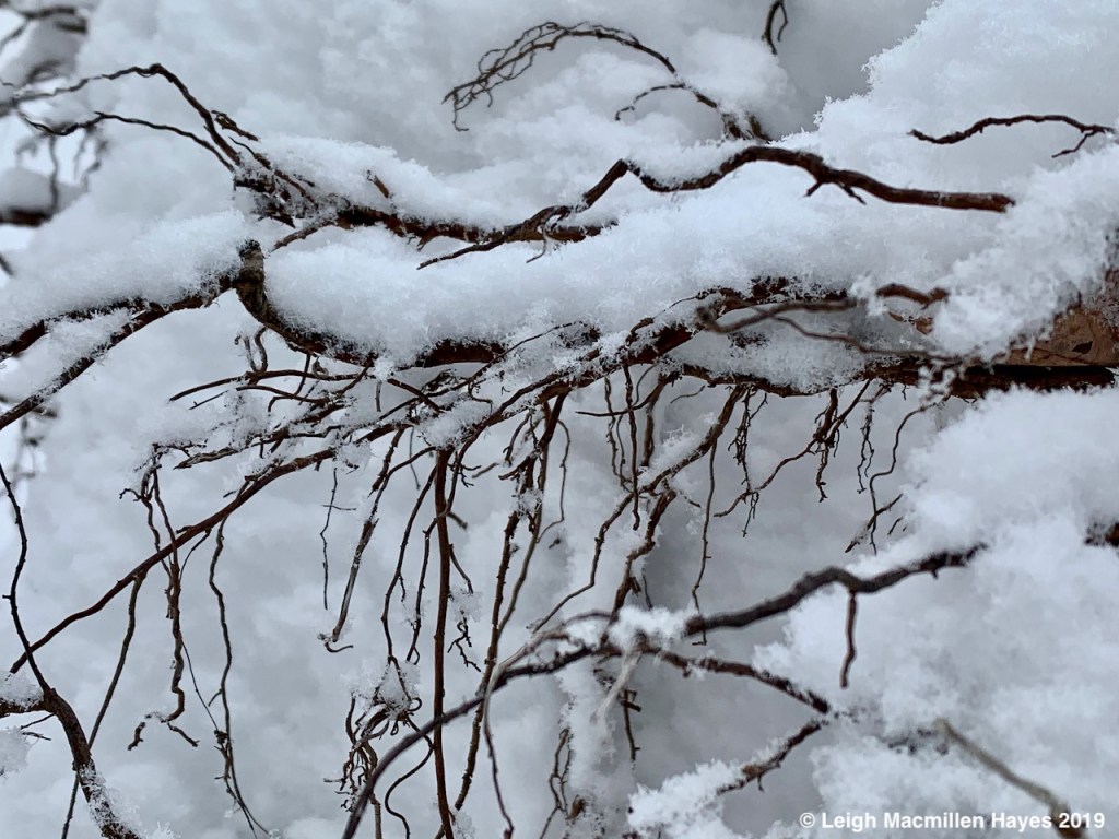 Where the water didn’t drip, it retained its grayish-green tone, and the contrast stood out. Curiously, snow sat atop some of the lichen’s structure, and one might have thought that all the lettuce-like leaves would have the brighter appearance, but today’s cold temp kept the snow from melting and coloration from changing.