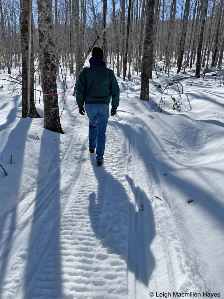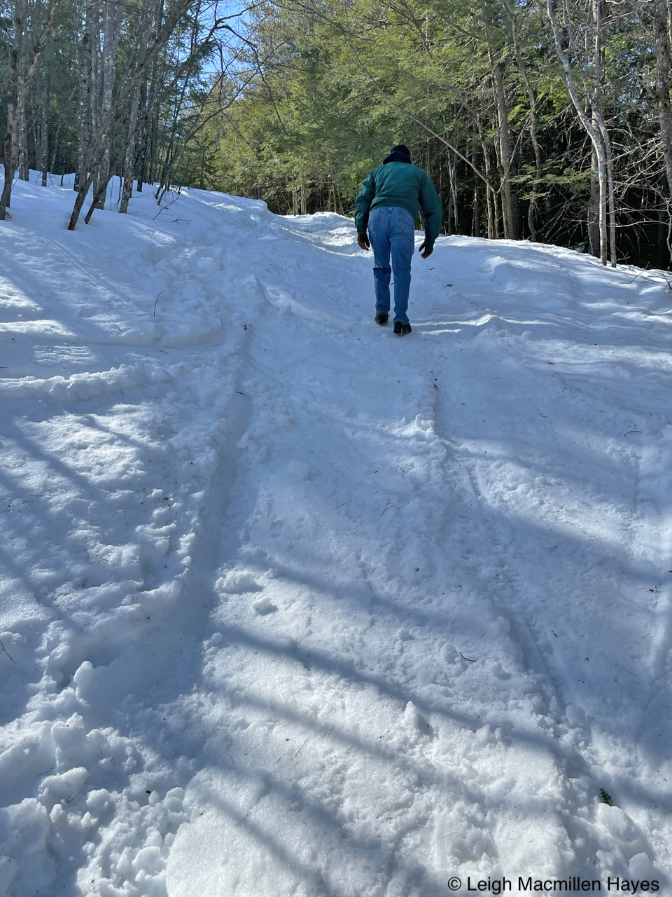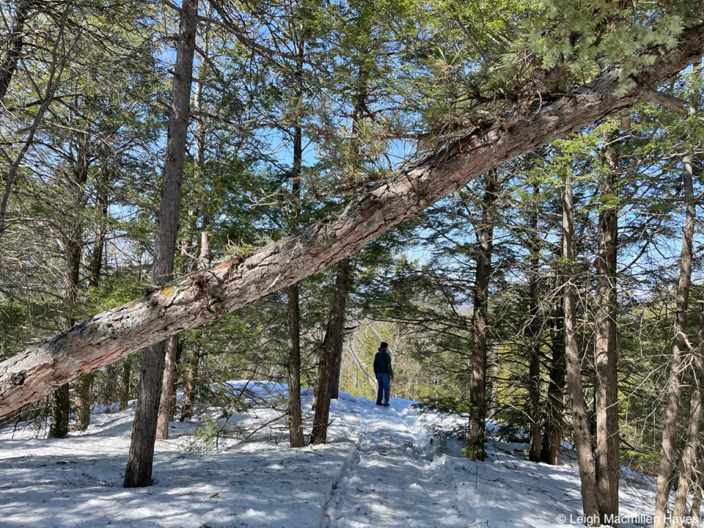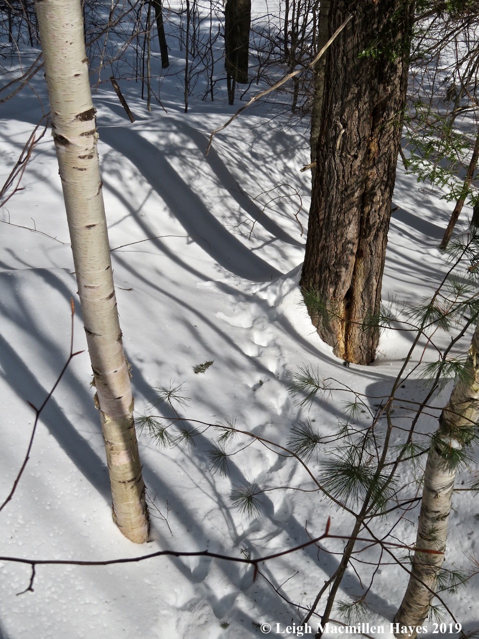 Often these trees are leaning, even if they don’t have snow piled upon them. And their lower branches remain on the tree, where Paper Birch tend to self-shed. The branches are pendulum, leaning toward the ground in an arc. And below each branch or where a branch had been, is a triangular shaped gray beard.