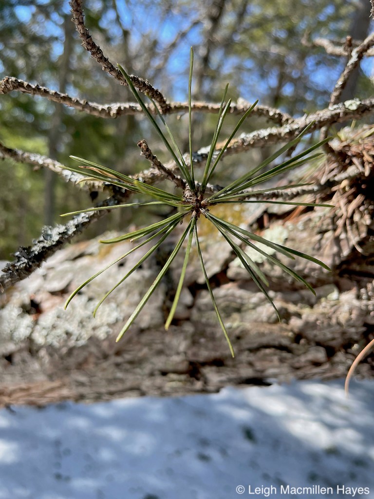 White Pine twigs are slender and gray-green to orange-brown. Bundles of five needles is the count for White Pine, which is cool because it spells its name: W-H-I-T-E, or M-A-I-N-E, since it is our State Tree. (Please remember that Red Pine has only two needles in a bundle, and doesn’t spell its name.)