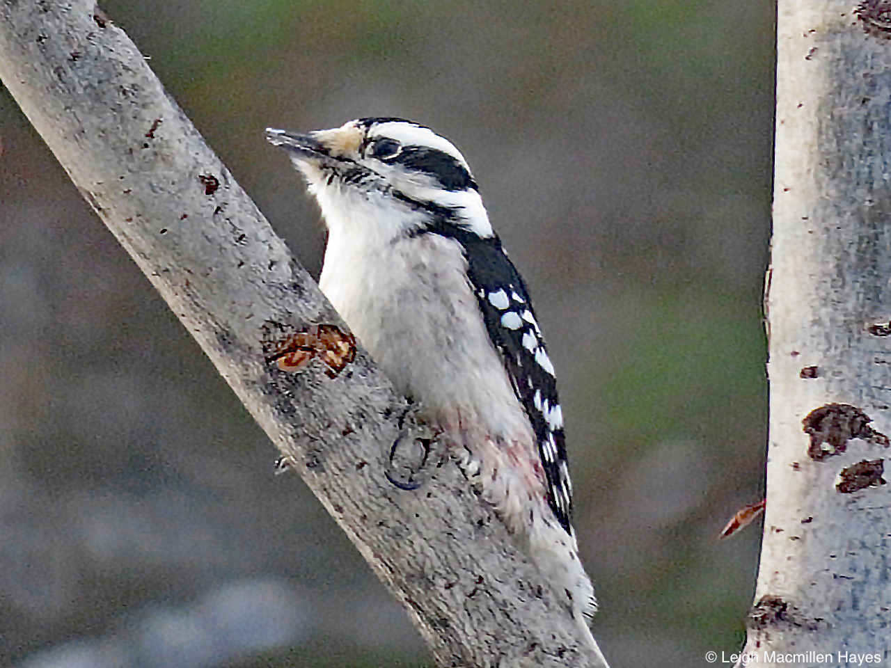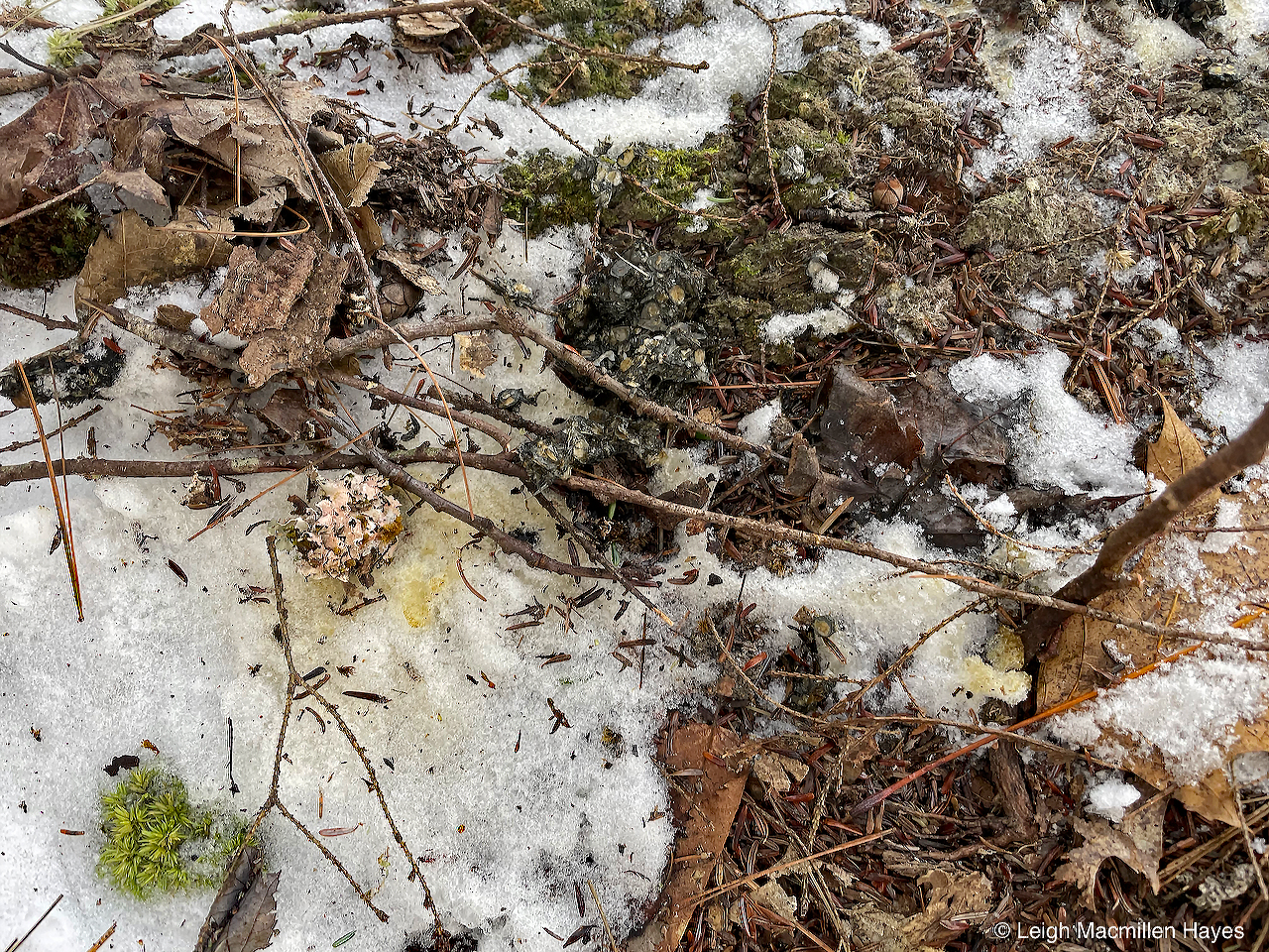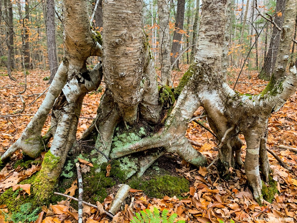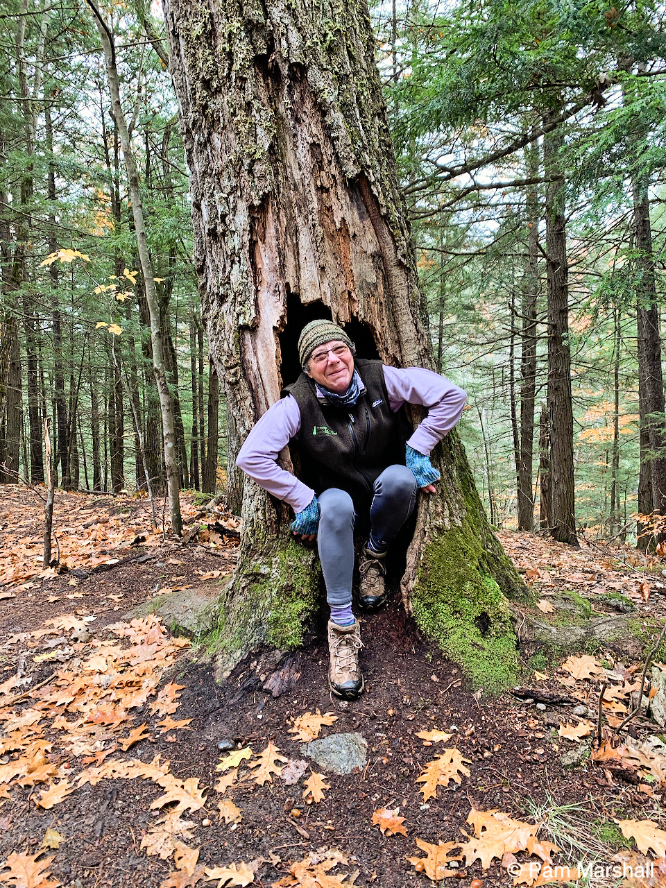 Because I was at a different summit that I frequent, I knew I had to check on the activity of the local residents and wasn’t disappointed. First, I followed their trails, where leaves are well packed. Those led to trees, but no downed nip twigs as one might expect. That could only mean one thing–there are still plenty of acorns on the ground for them to eat. Because I was searching, however, I was thrilled to discover one sign that the season is changing. I knew that by the five layers I was wearing, but the stripped bark and cambium layer of a birch indicated the same. A porcupine’s diet varies with the offerings and part of their winter dining includes just this. Notice, too, the pattern of the incisor marks. Such a design thrills me no matter how often I encounter it.