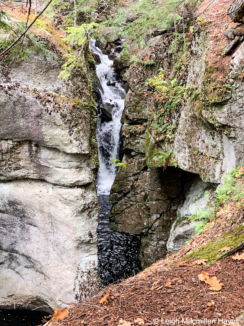 One of the porky trails led into a crevice below where I stood. It was there that I caught the first glimpse of icicles and knew I had to climb down. My route wasn’t the same as the porcupine’s for I’m not quite as nimble on rocks and slippery leaves.